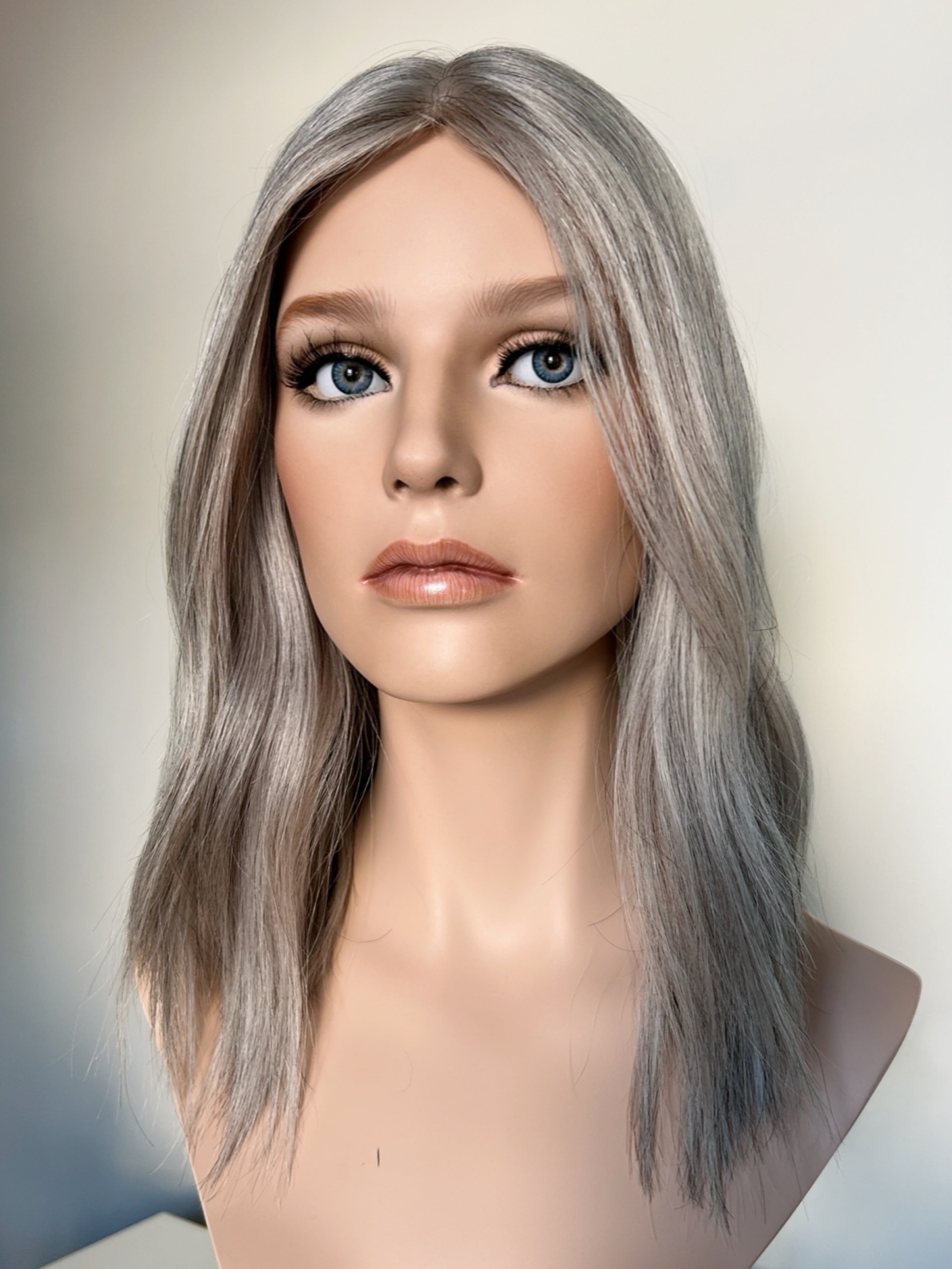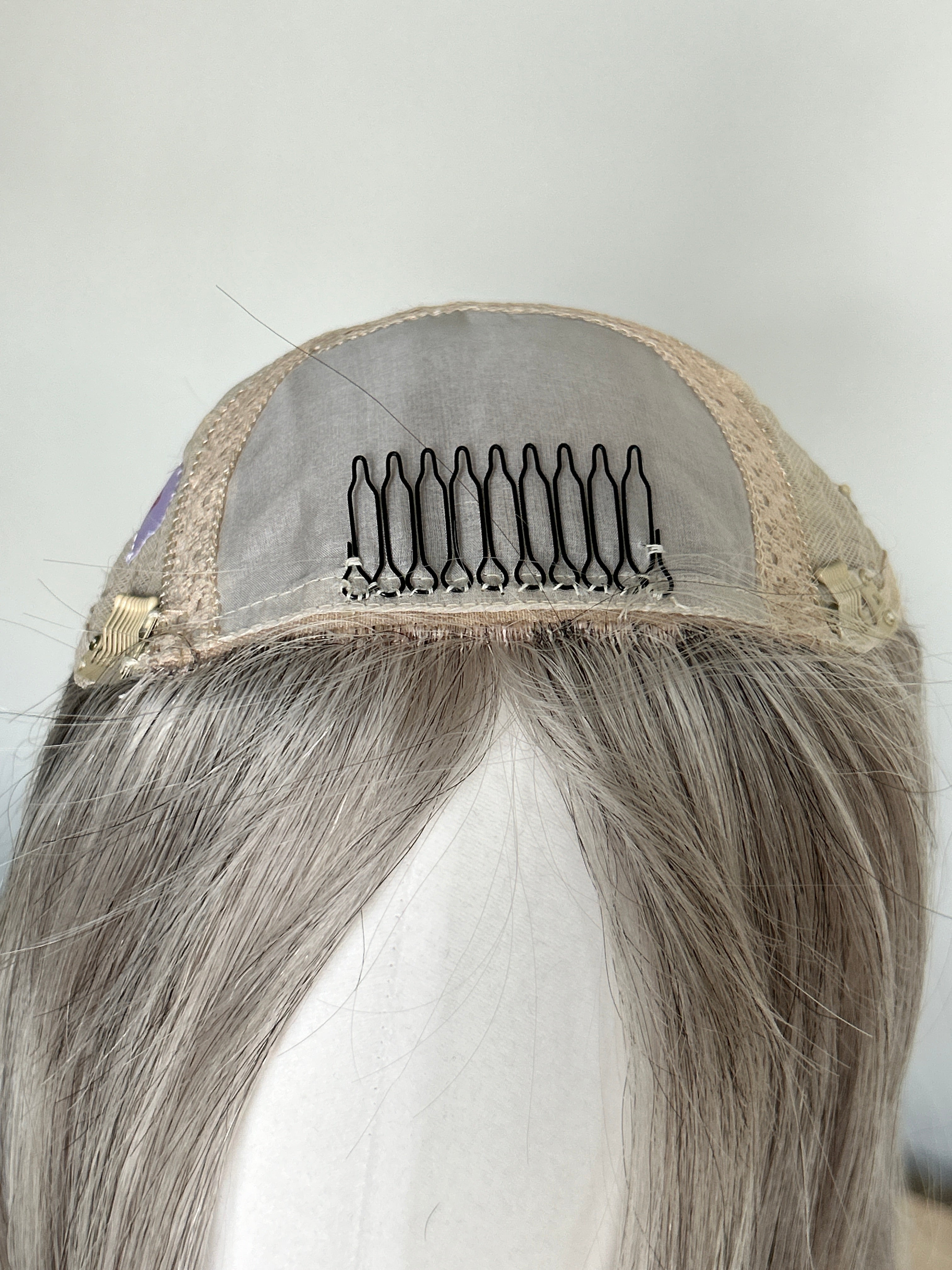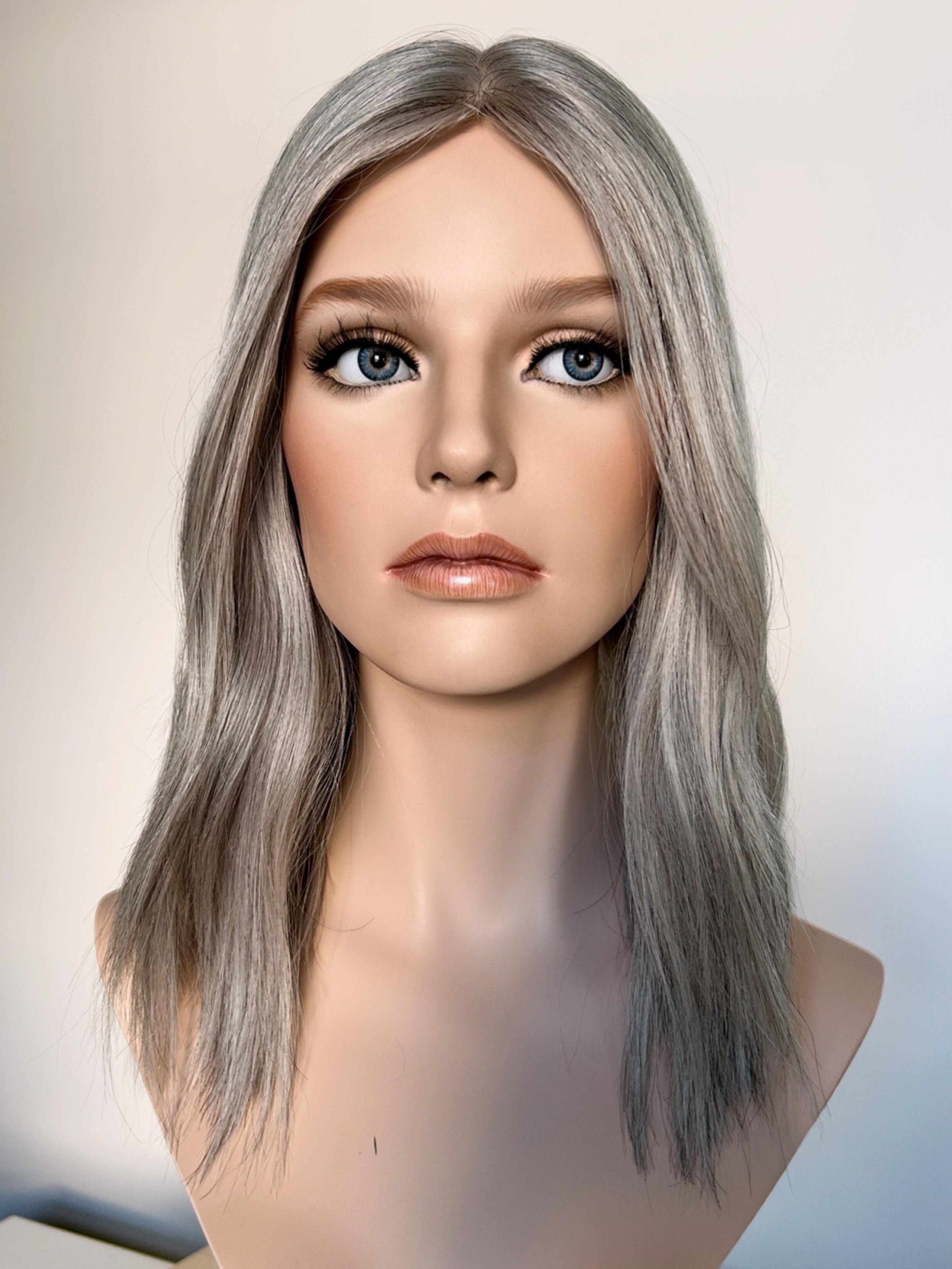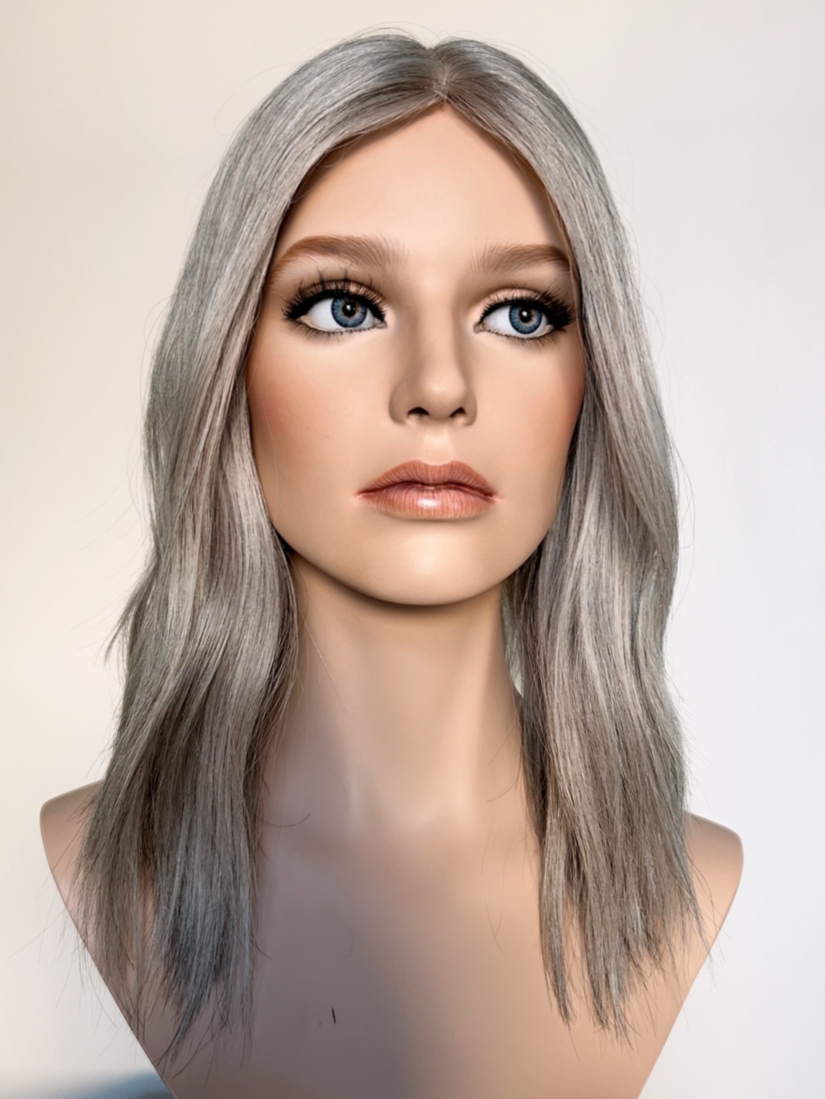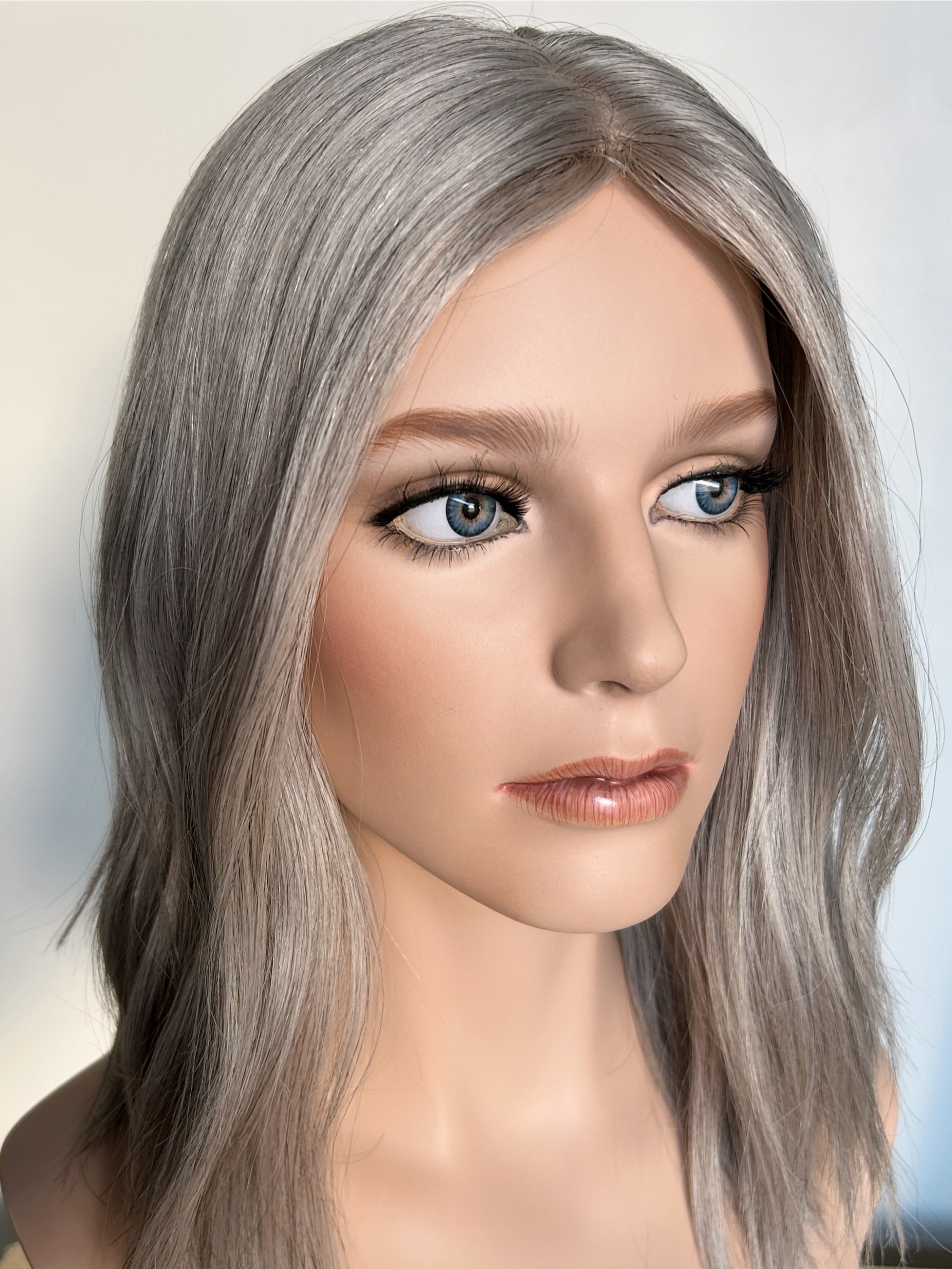 Blush - a silk top topper in lovely salt and pepper silver, perfect if you're looking for something to match light grey natural hair.