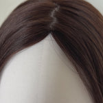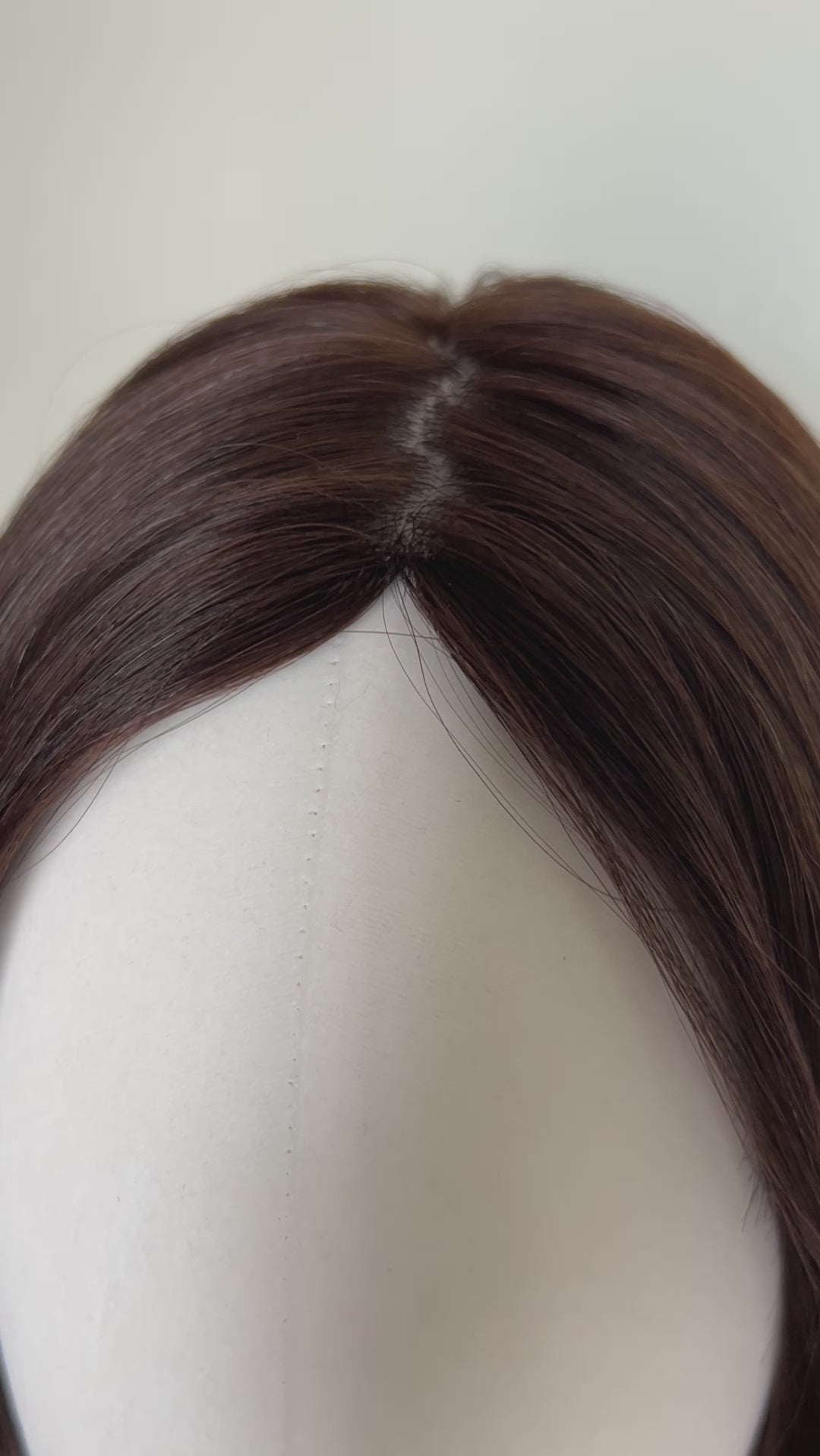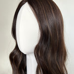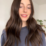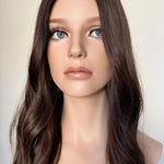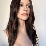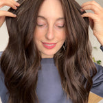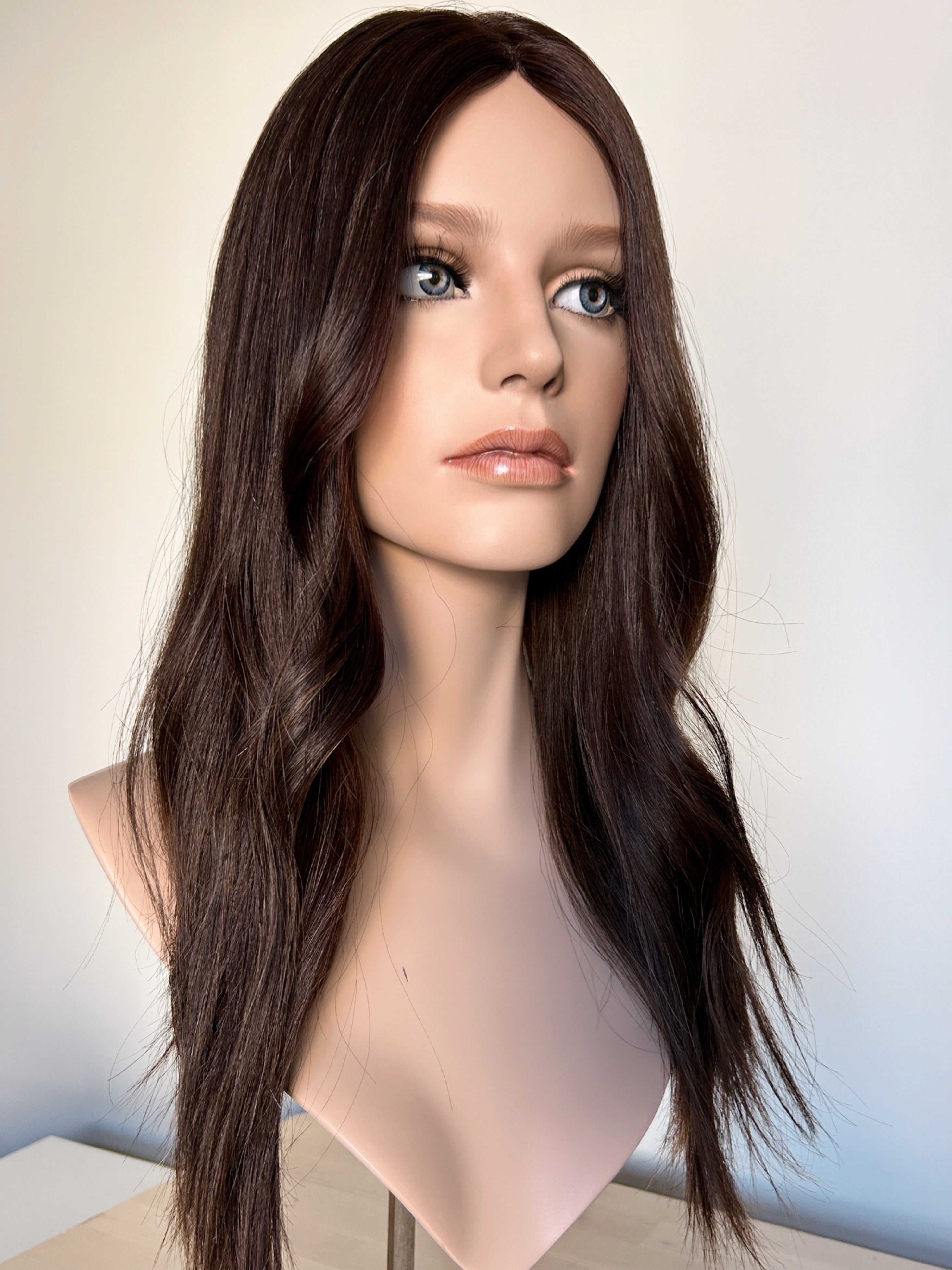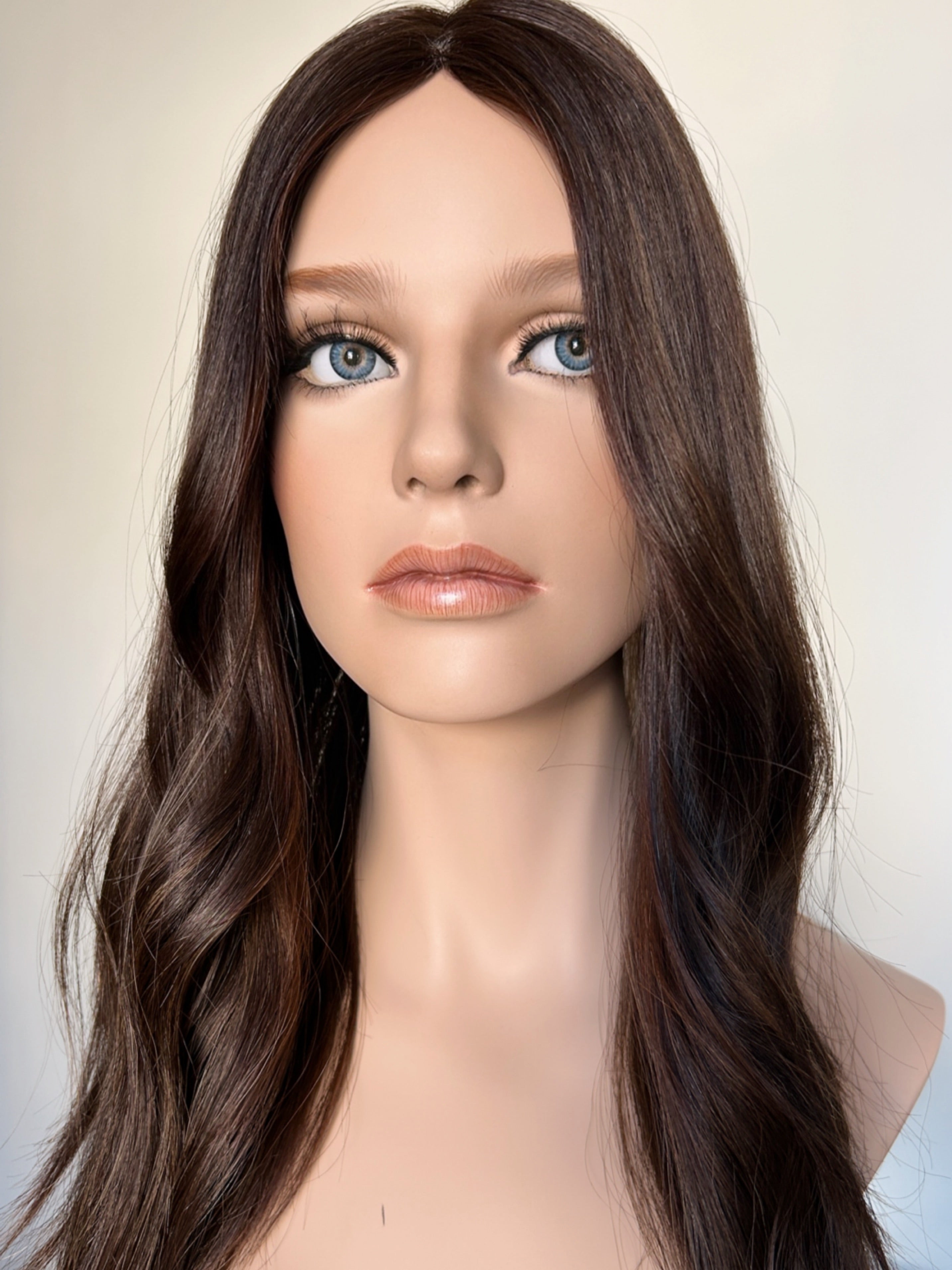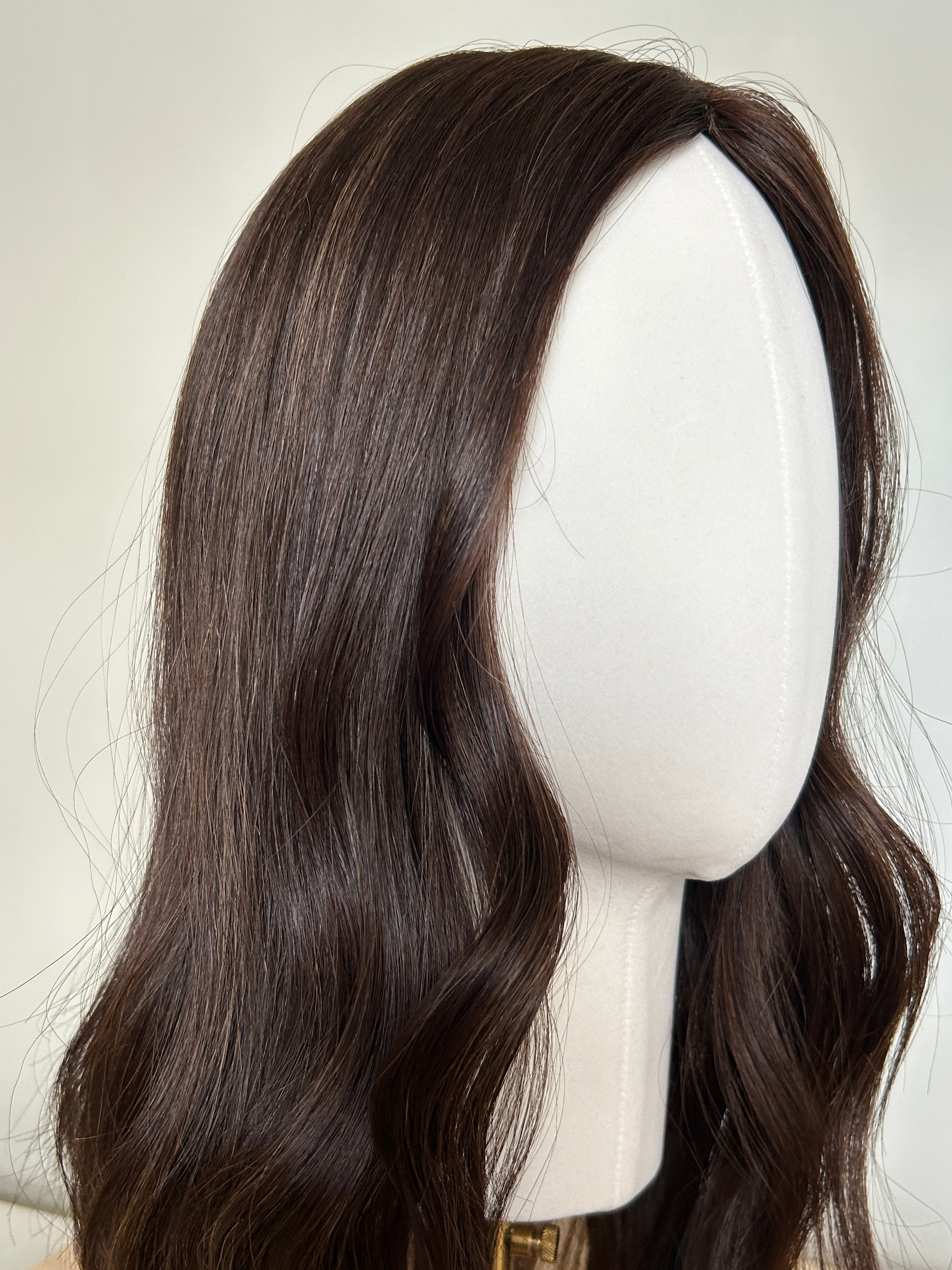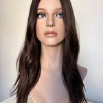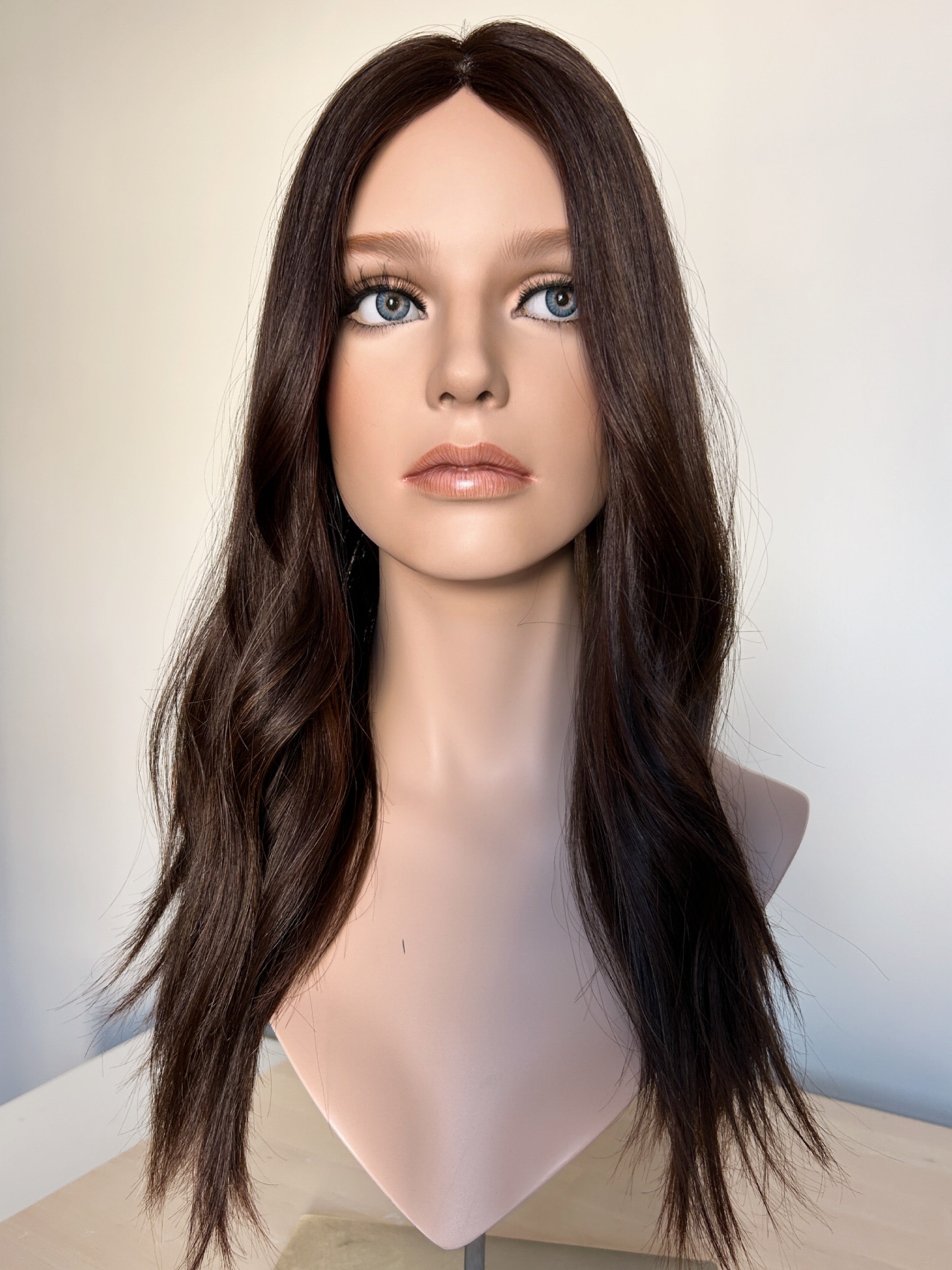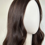Bluebell- a silk top clip in topper in level 3 dark brunette, with subtle neutral highlights. It has soft layering and a subtle face frame and is ready to wear straight out of the box!