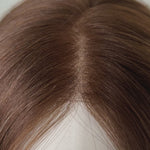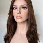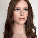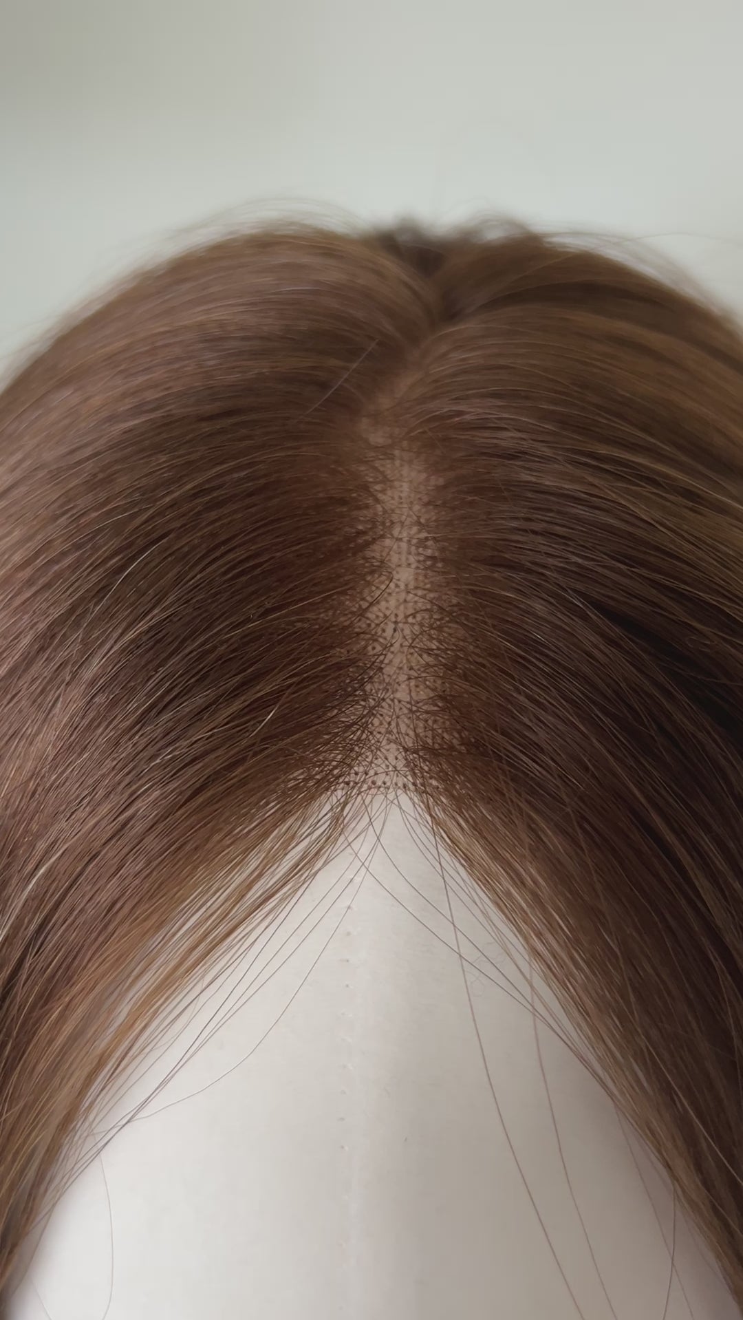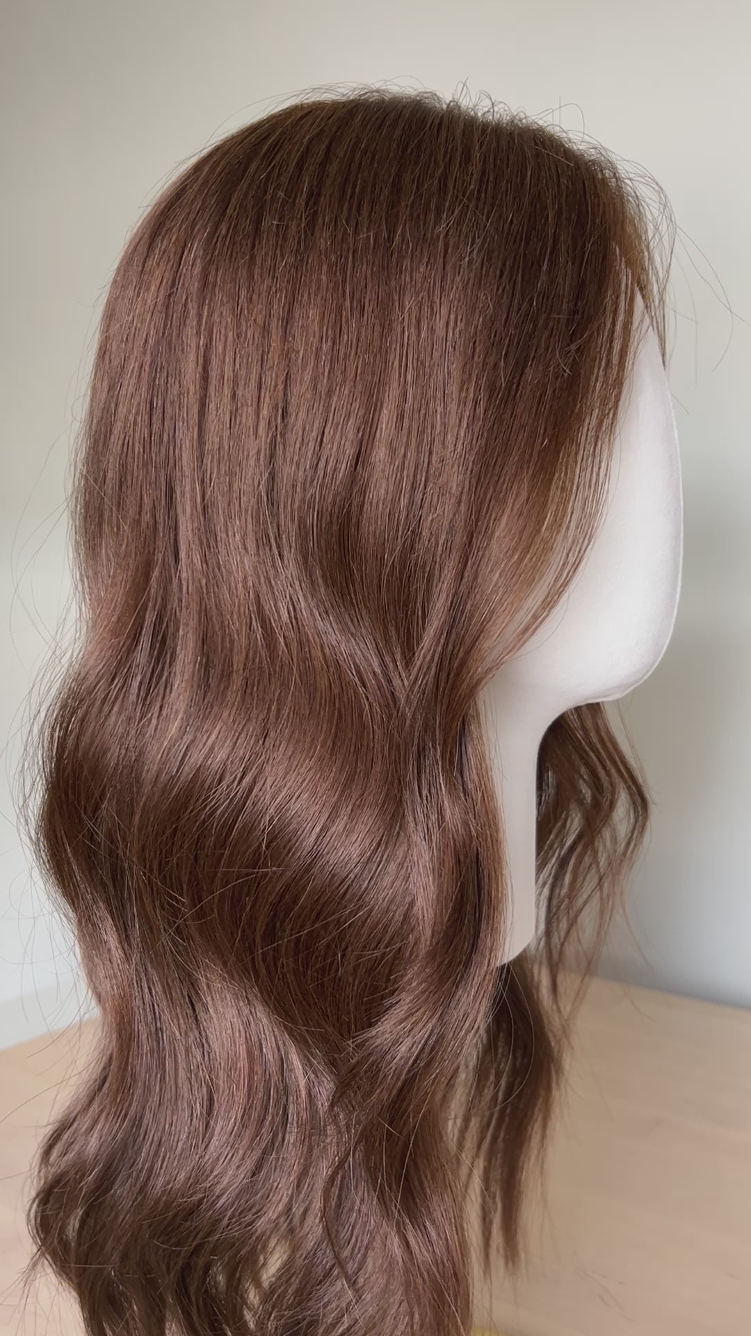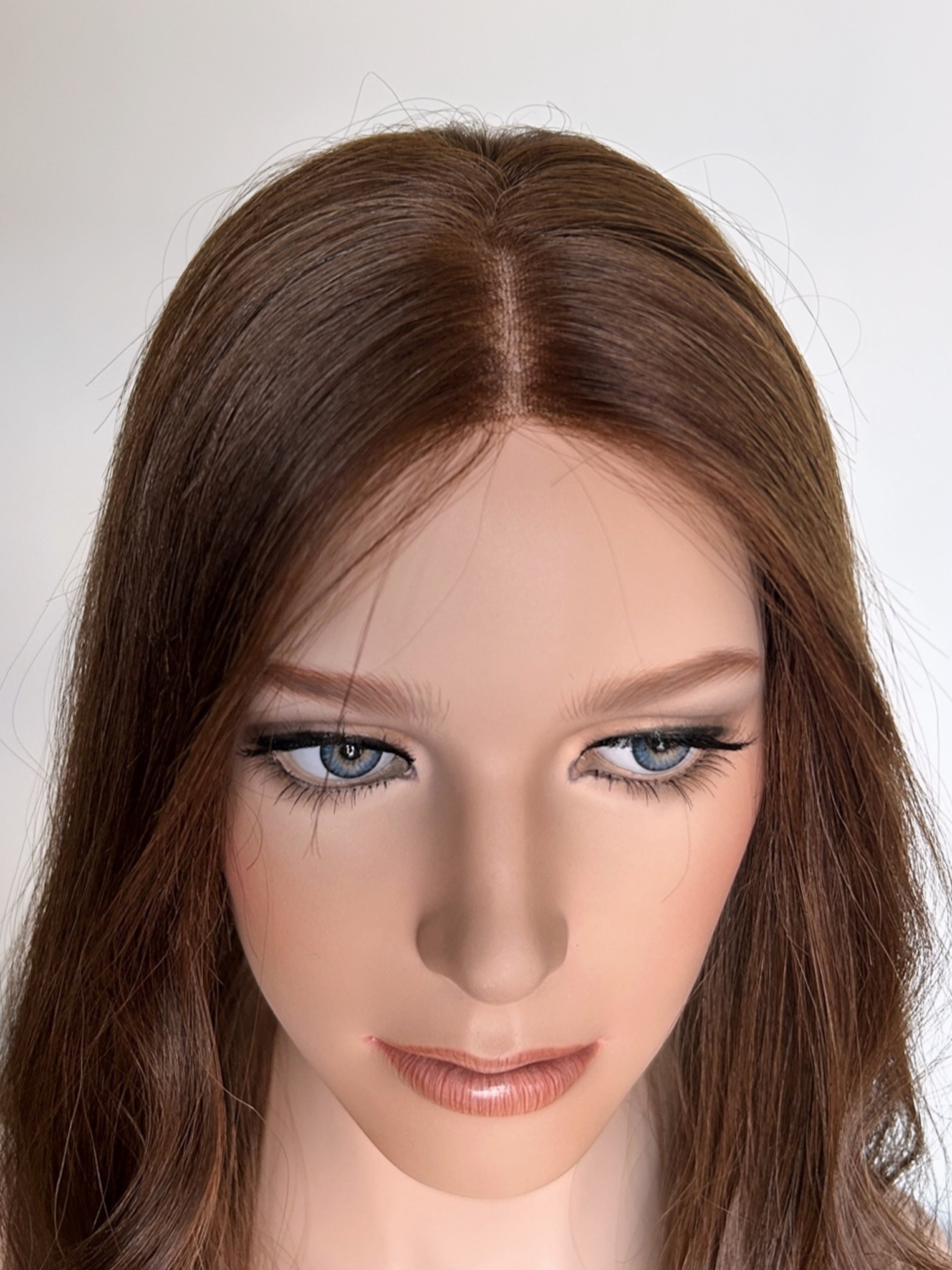 Carnation - a lace top clip-in topper in medium warm brunette with subtle golden dimension. Cut with soft layers and a gentle face frame for easy styling and blending.