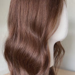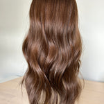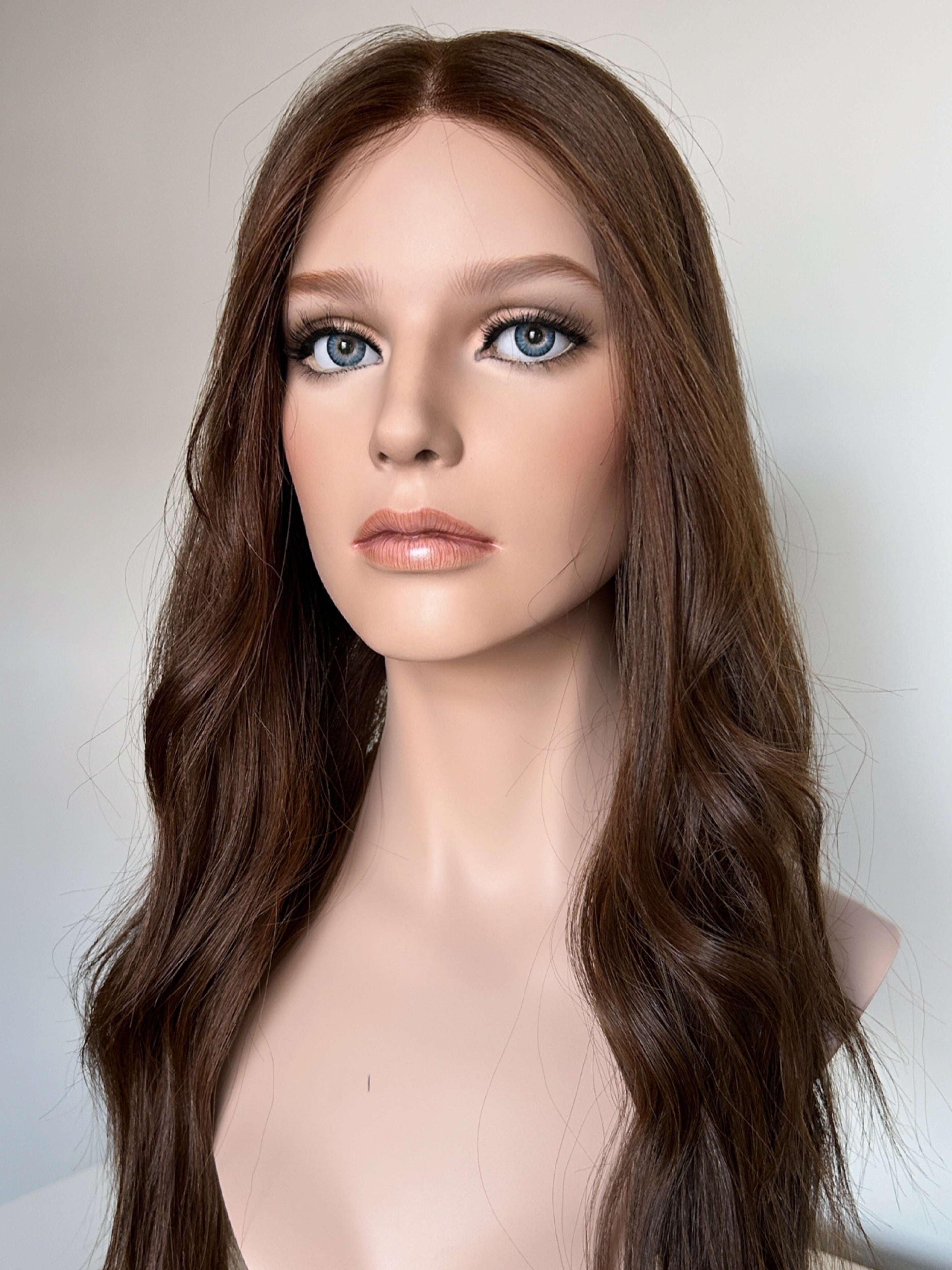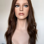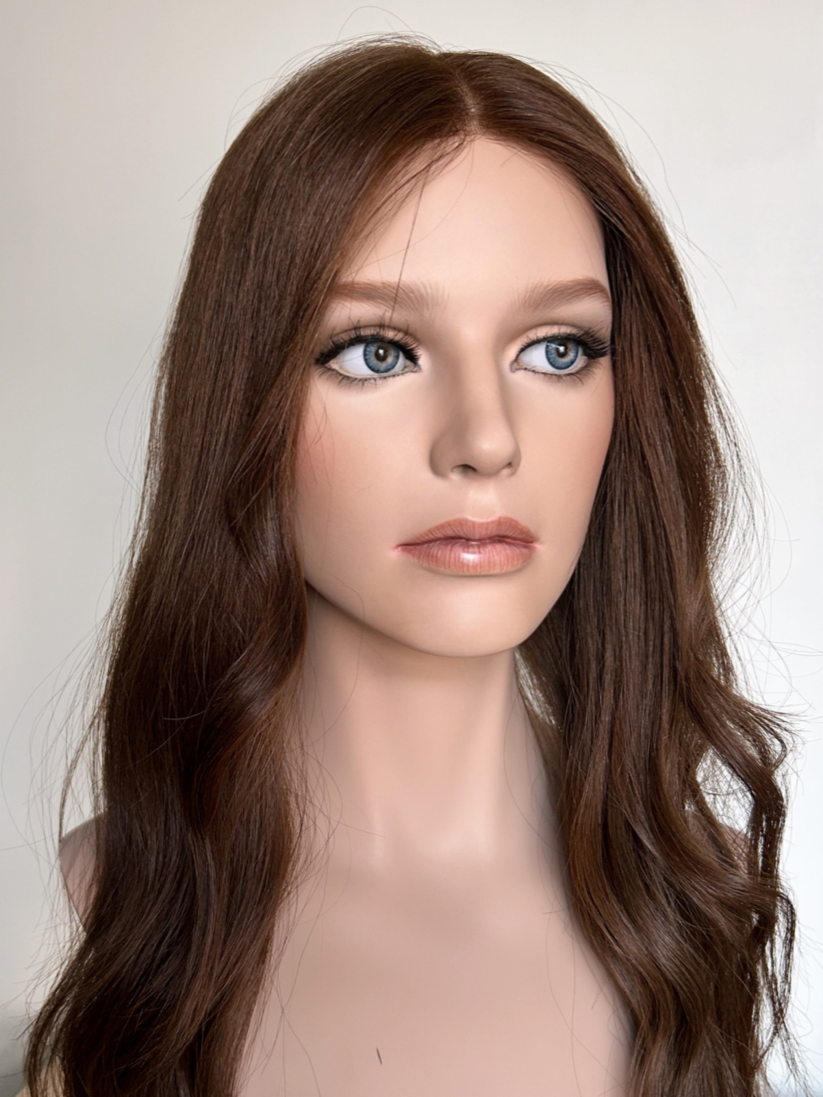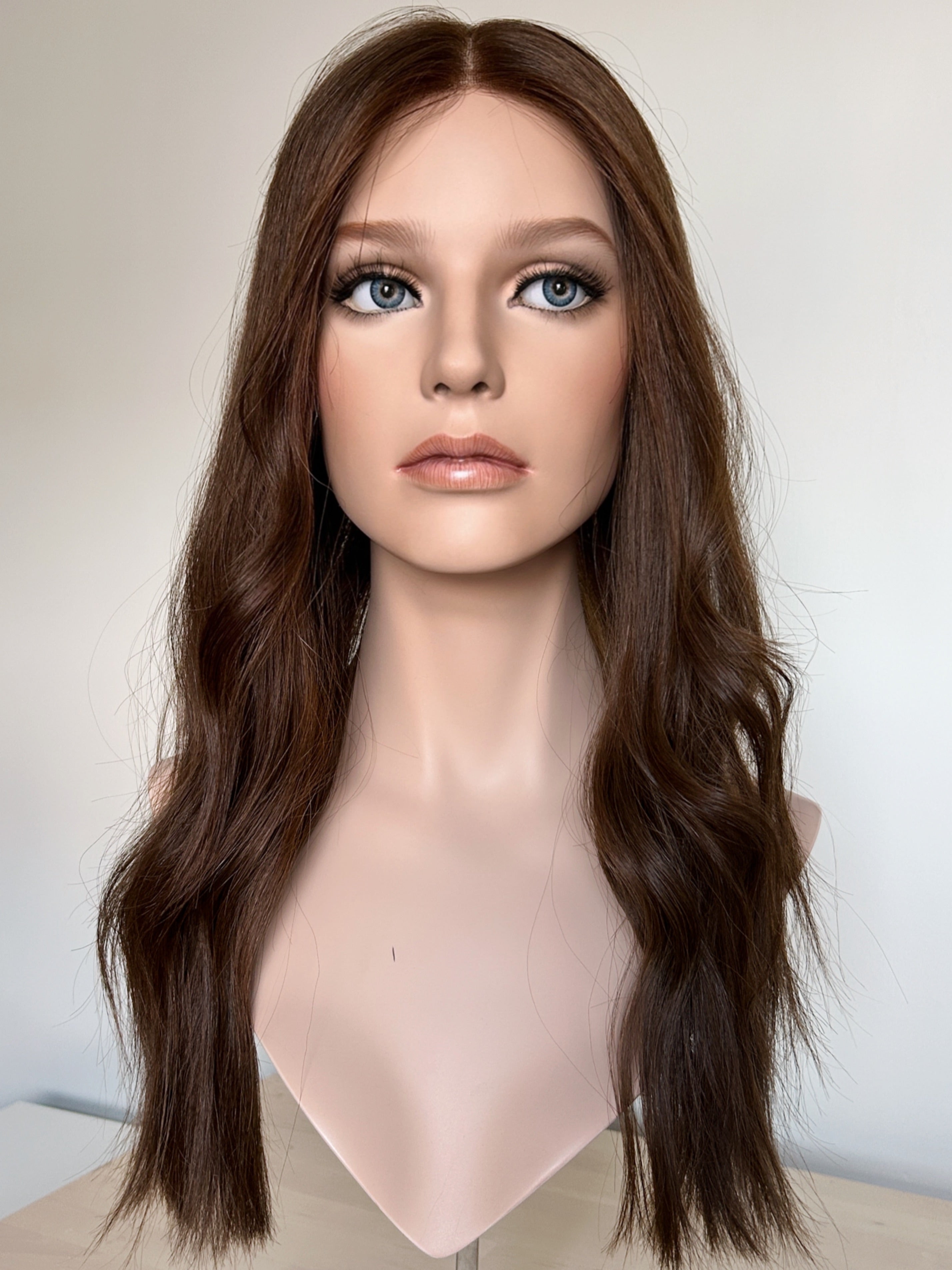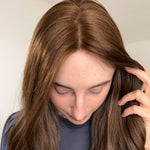 Carnation - a lace top clip-in topper in medium warm brunette with subtle golden dimension. Cut with soft layers and a gentle face frame for easy styling and blending.