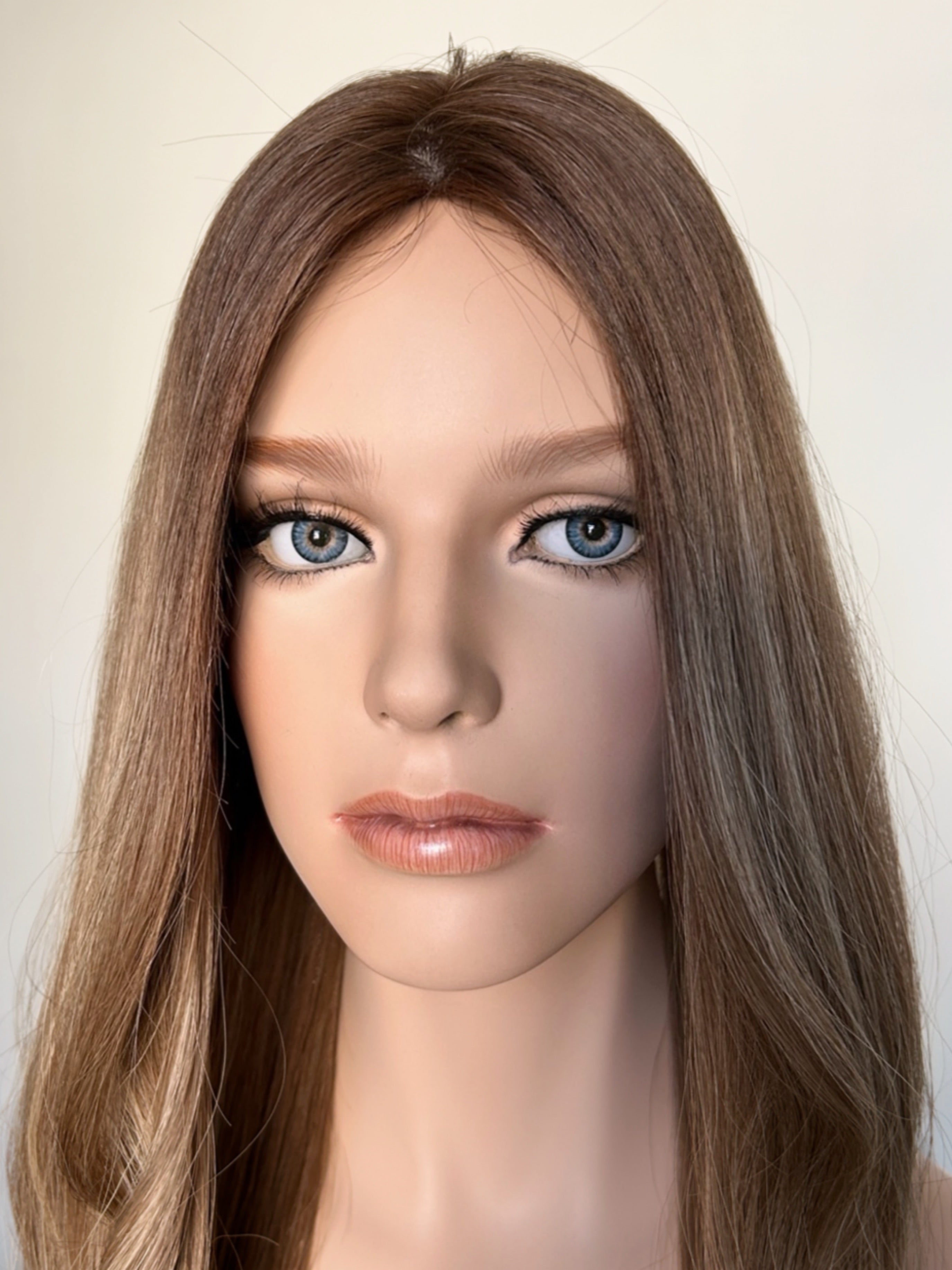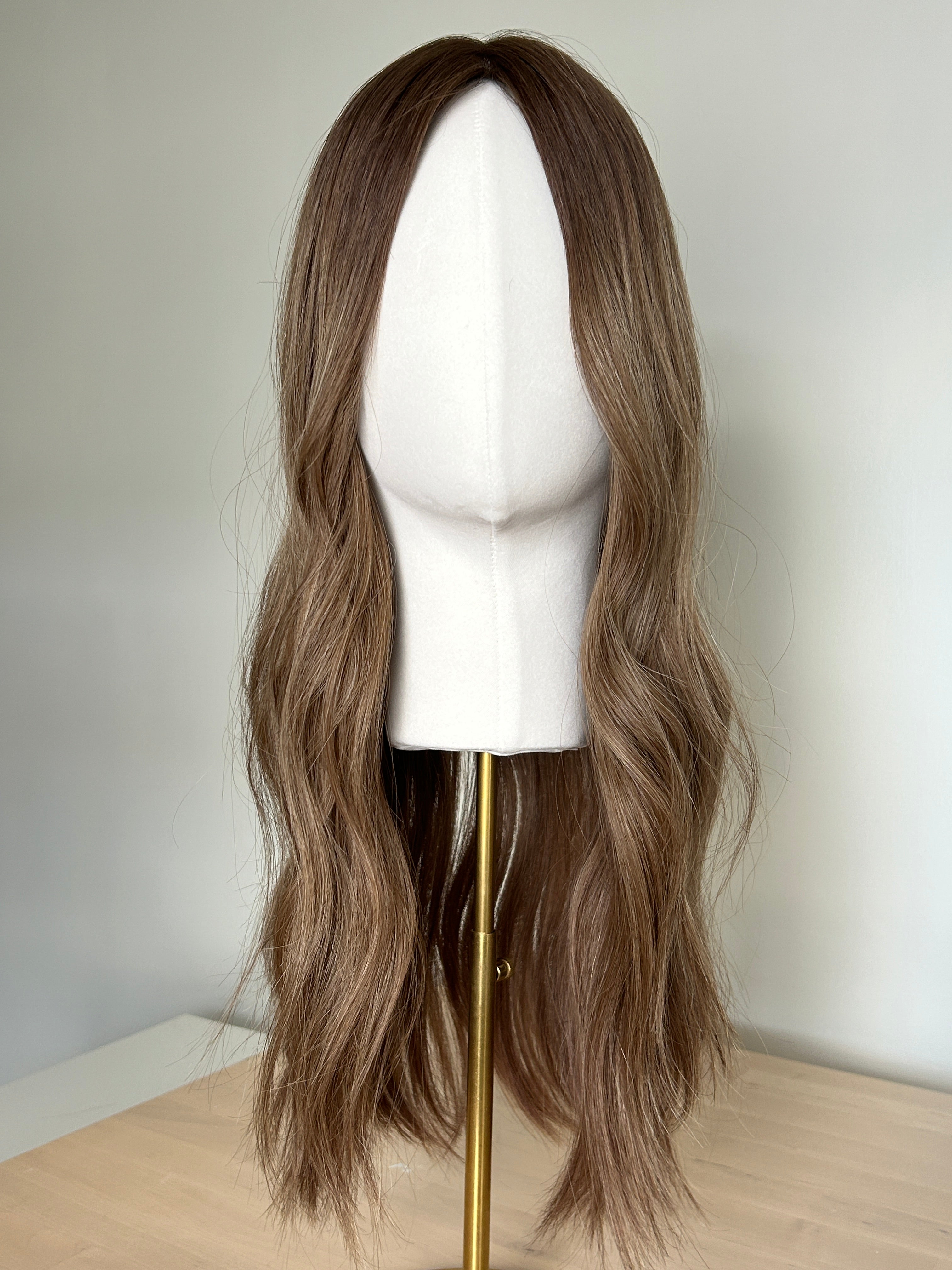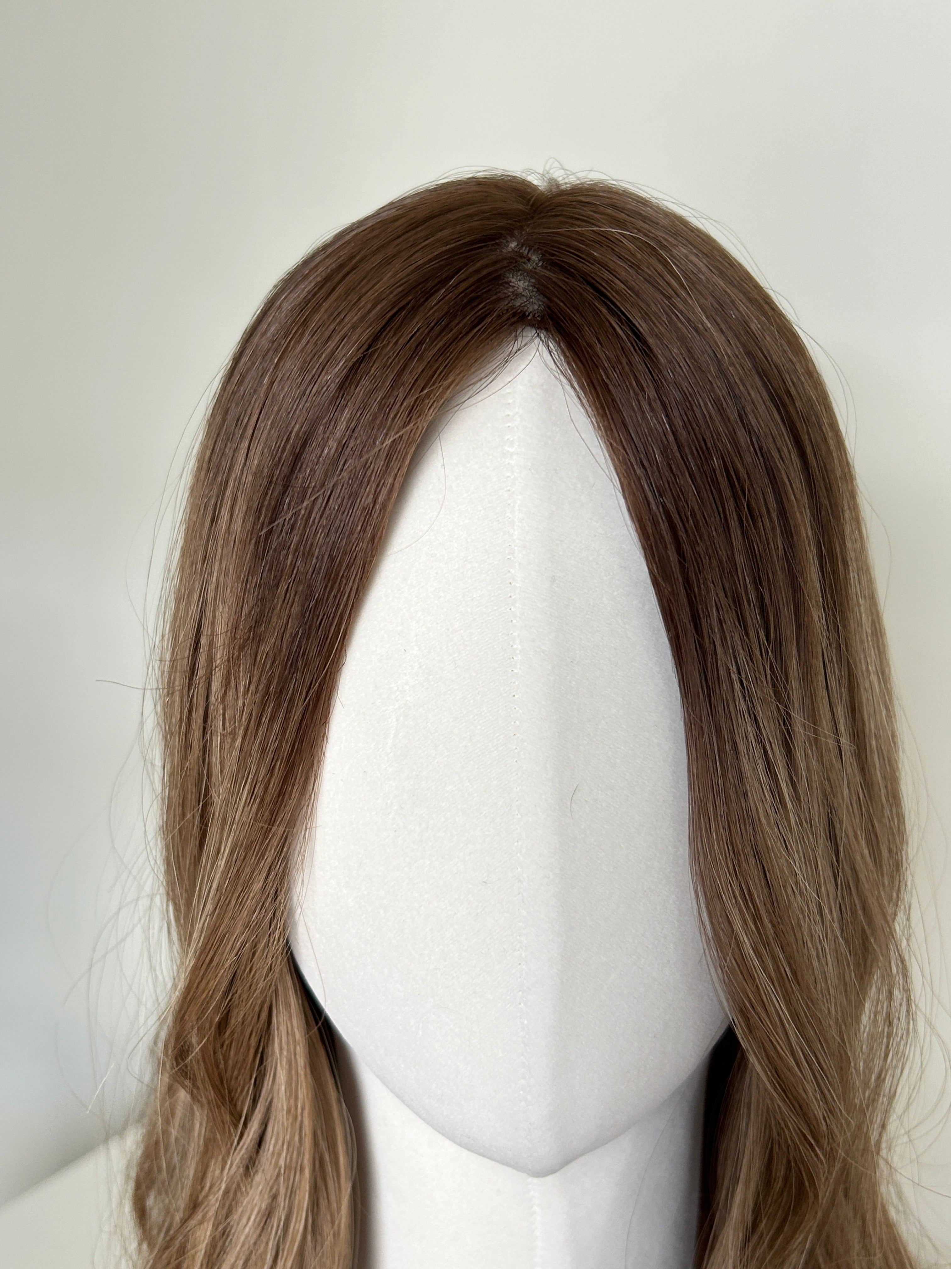 LILY - a silk top topper in dark neutral blonde with ash blonde subtle highlighting, with light brunette stretch rooting. It has been cut and customized, and subtle layering has been added along with a light face frame.