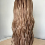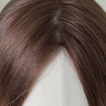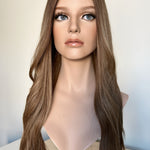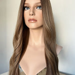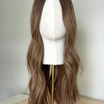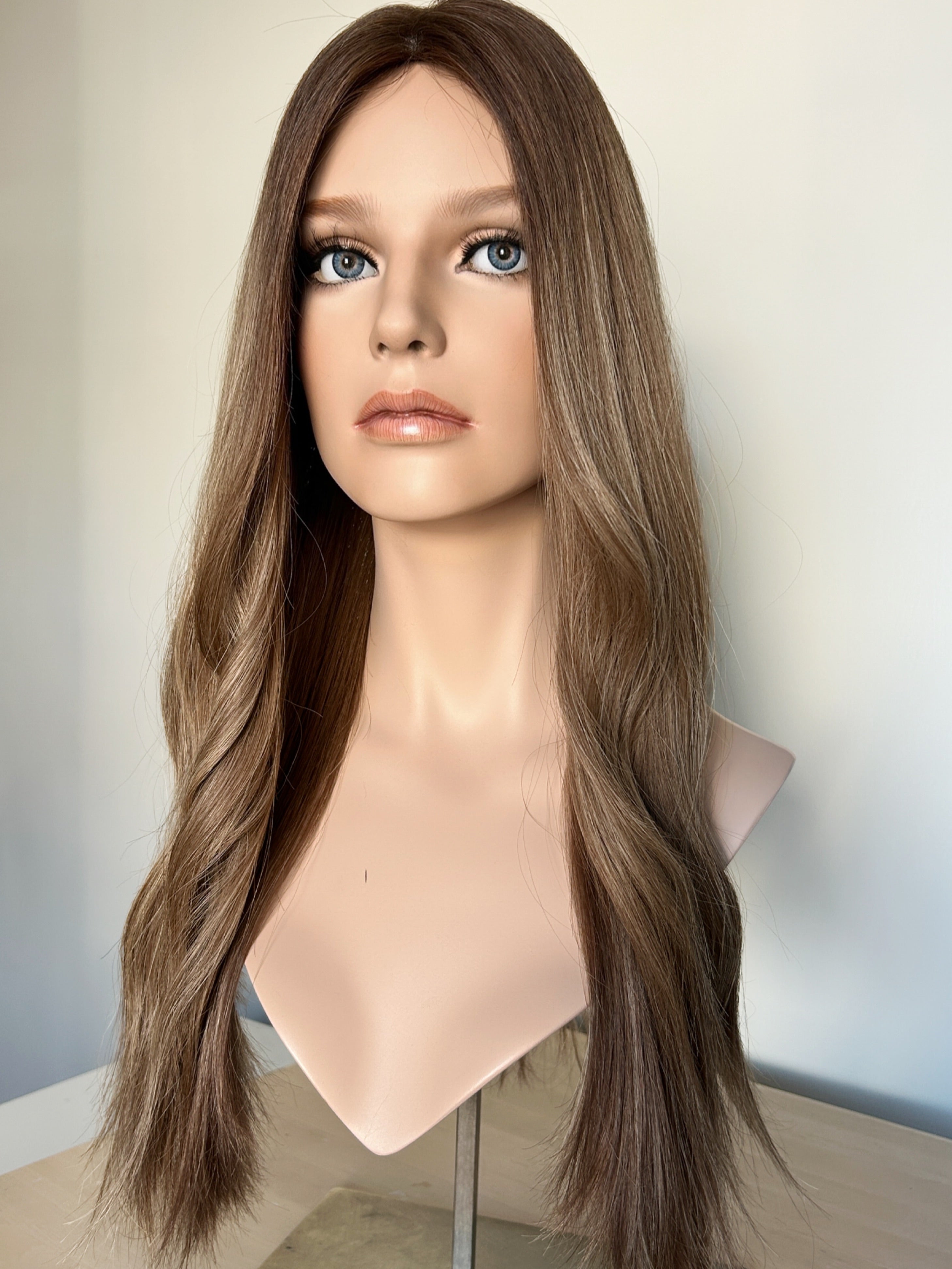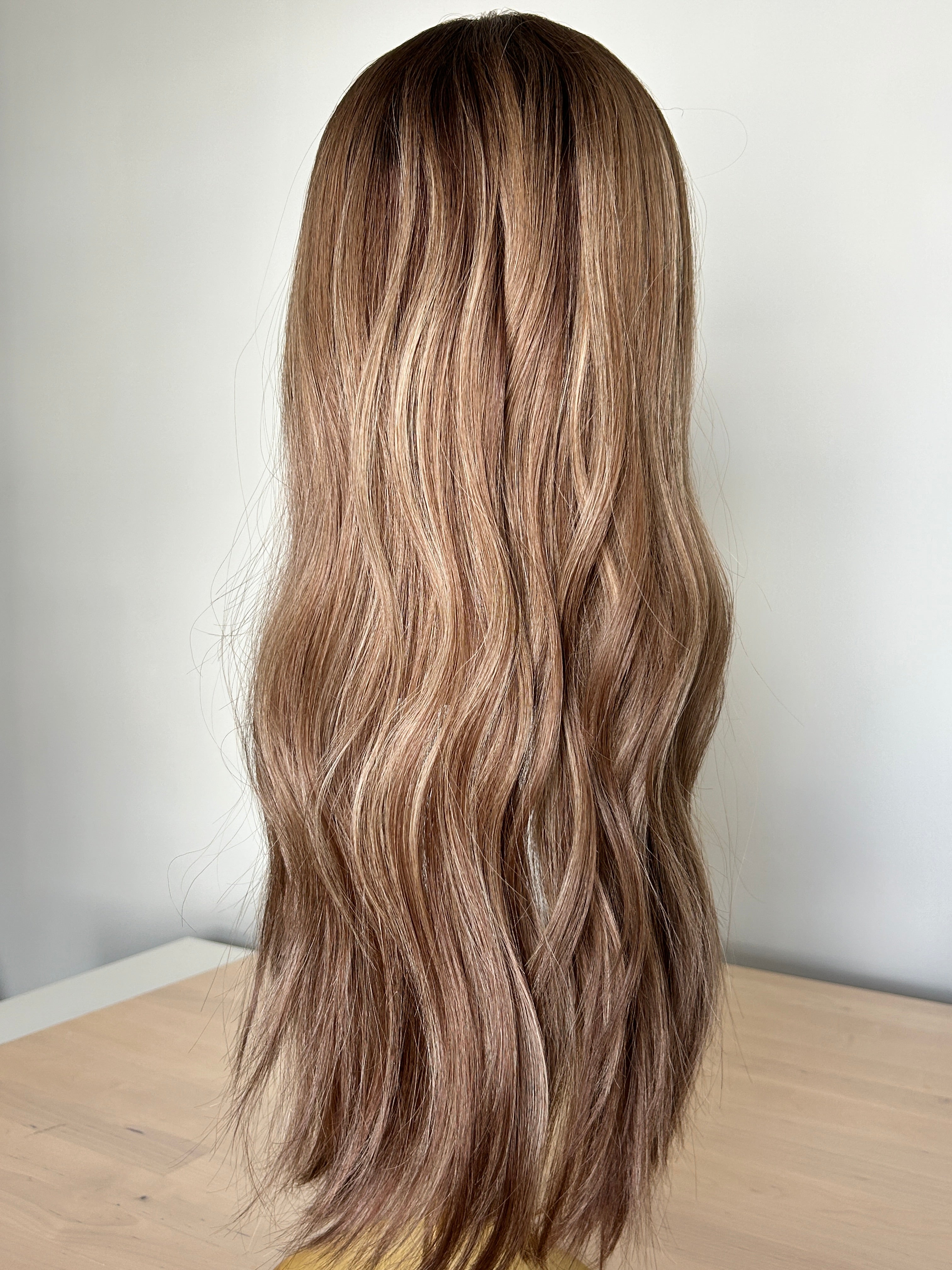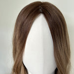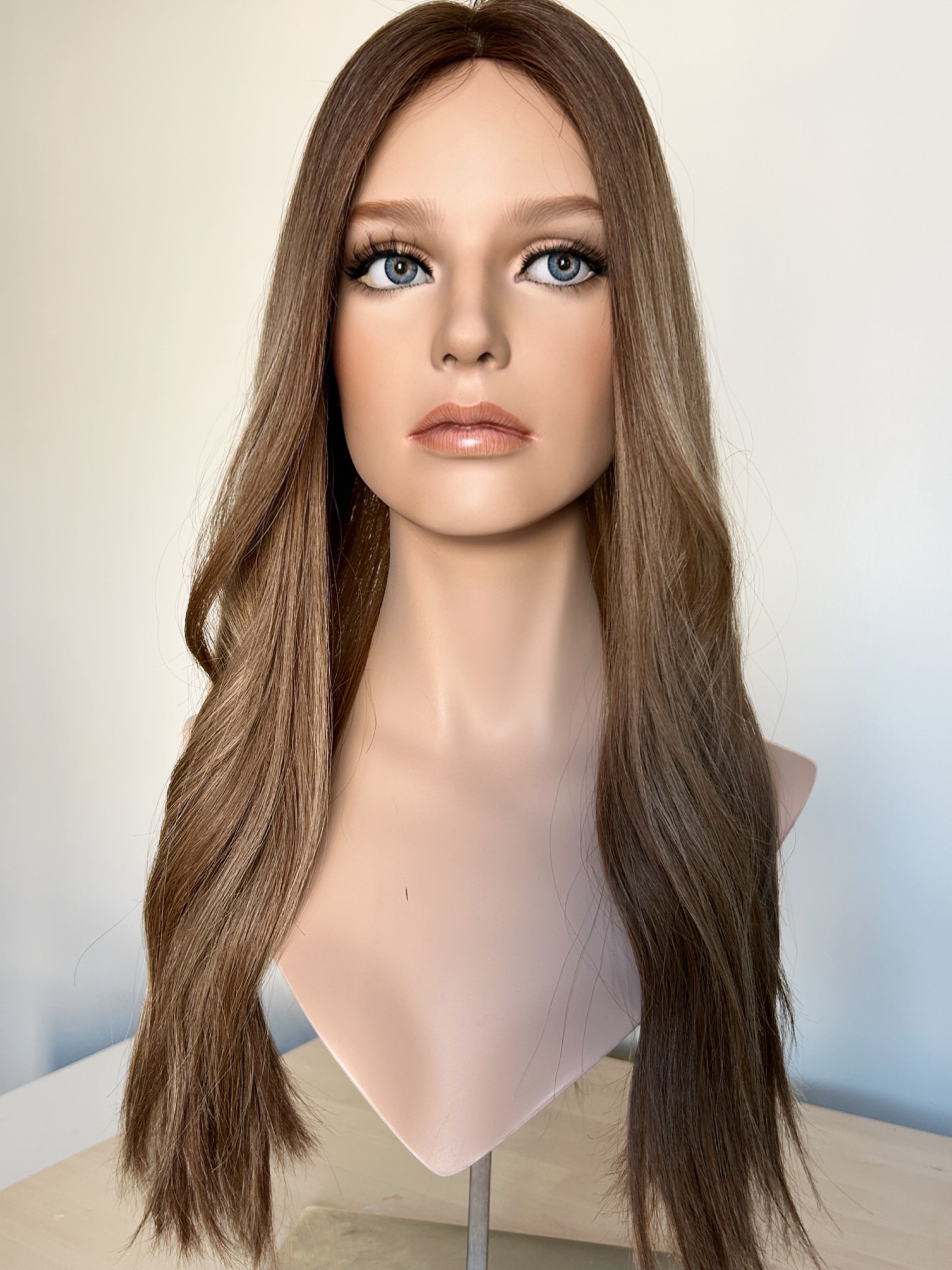LILY - a silk top topper in dark neutral blonde with ash blonde subtle highlighting, with light brunette stretch rooting. It has been cut and customized, and subtle layering has been added along with a light face frame.
