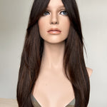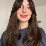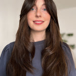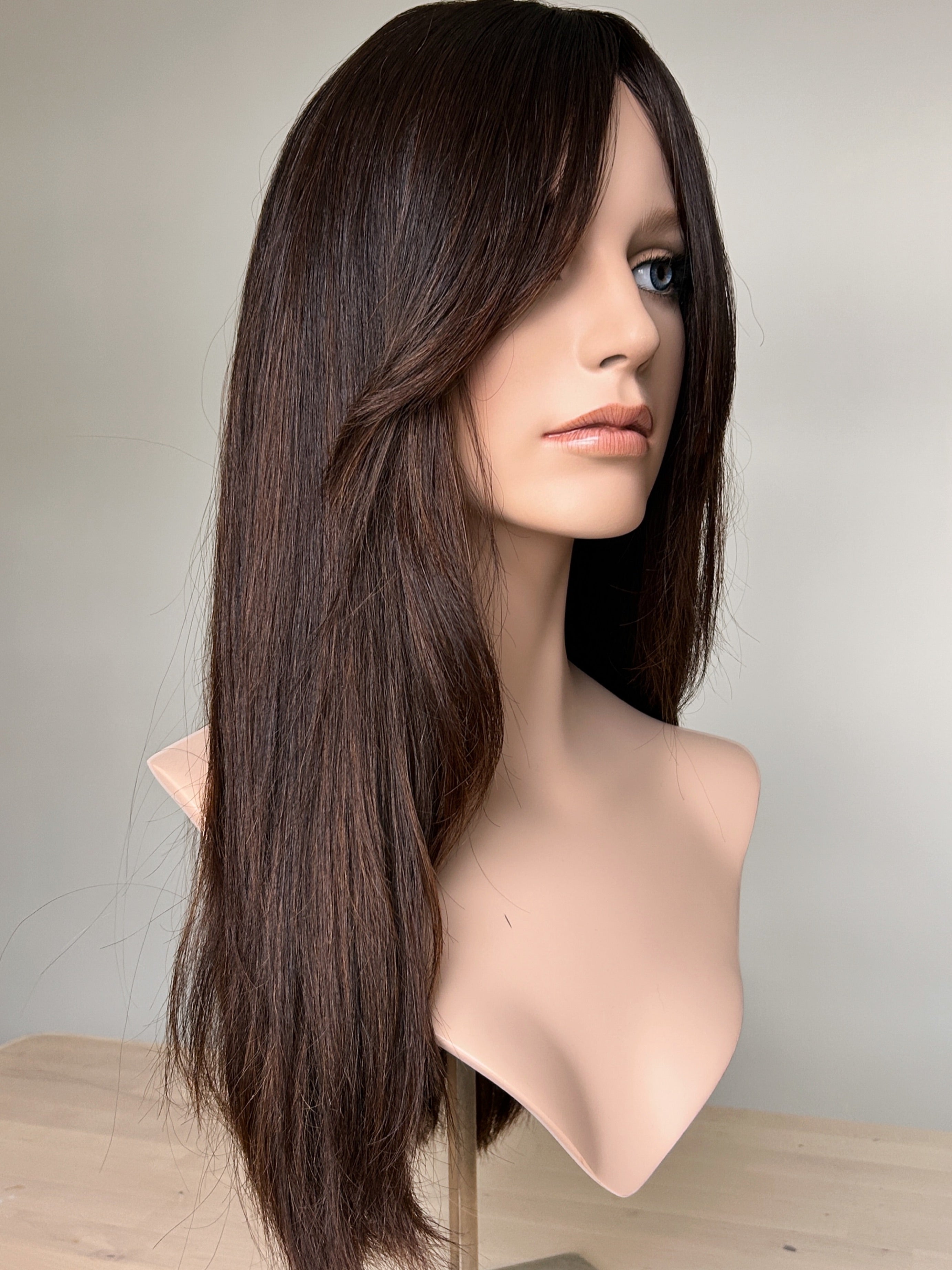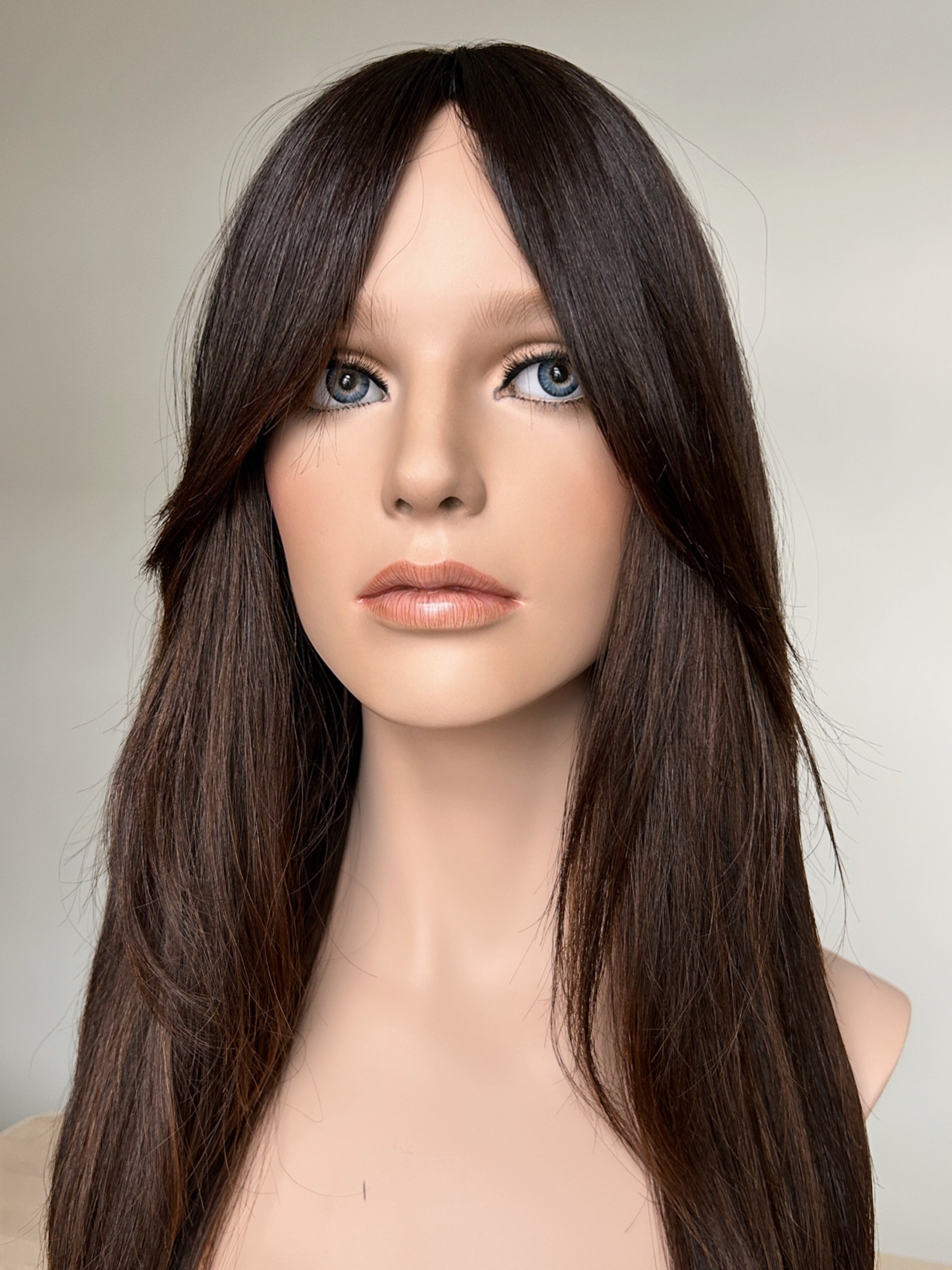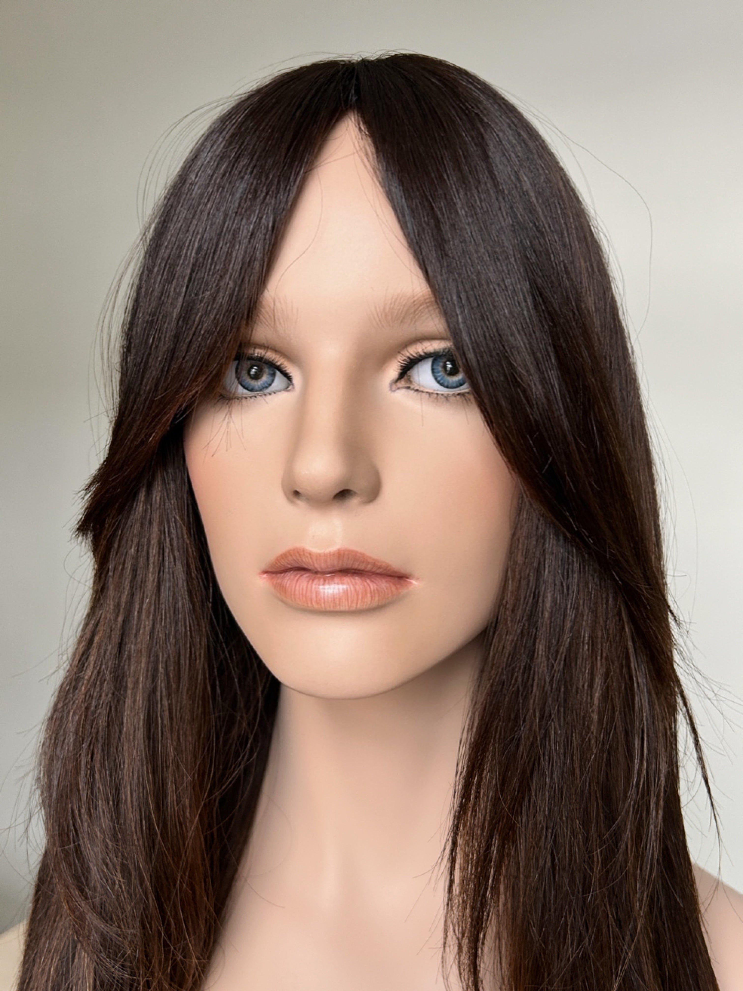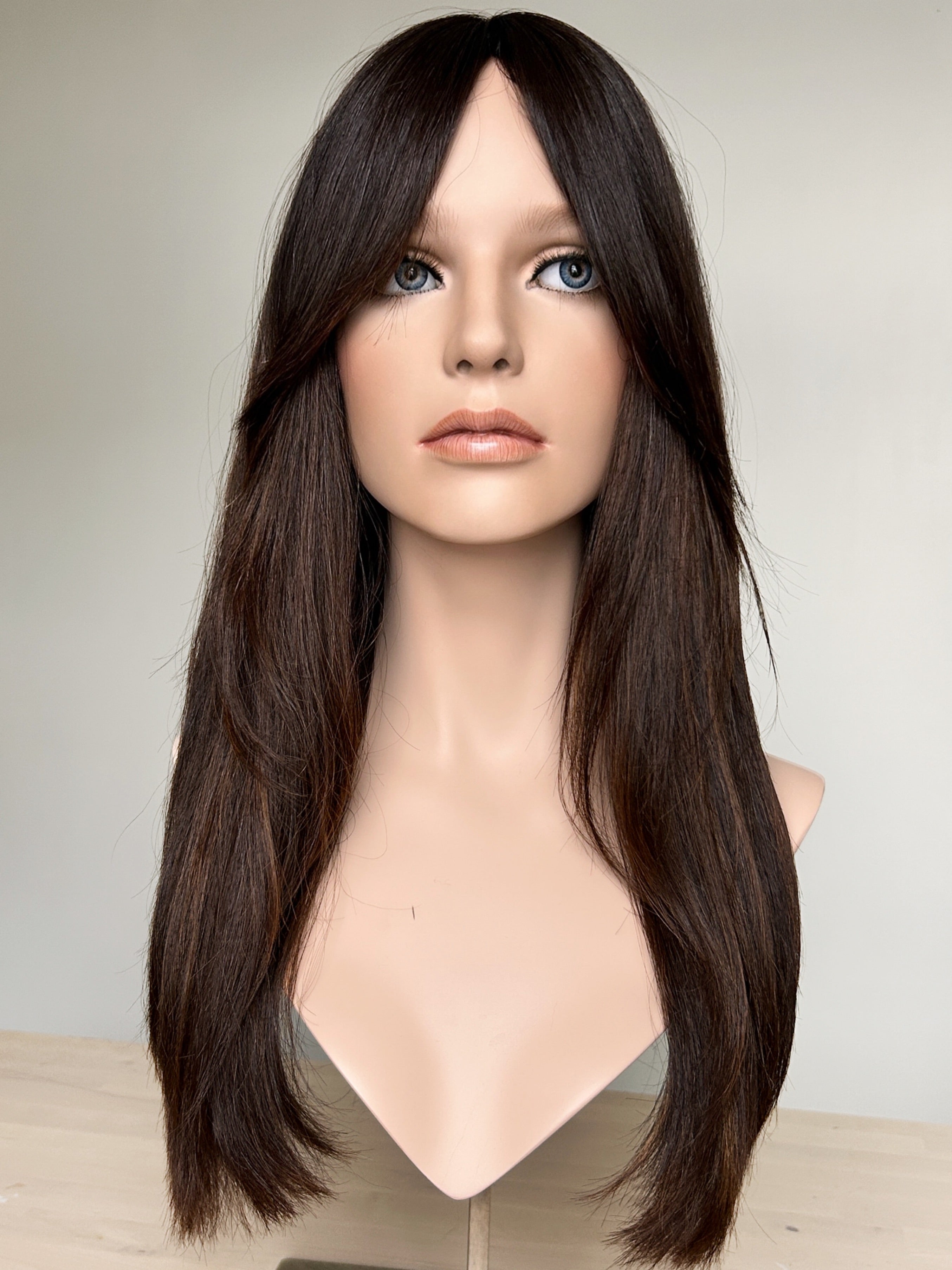 Callaia - a silk top wig in dark virgin brunette, with a subtle warm balayage throughout. This wig has had a full custom cut, with layering and long, sweeping curtain bangs added- graduating down into a feathered face frame.