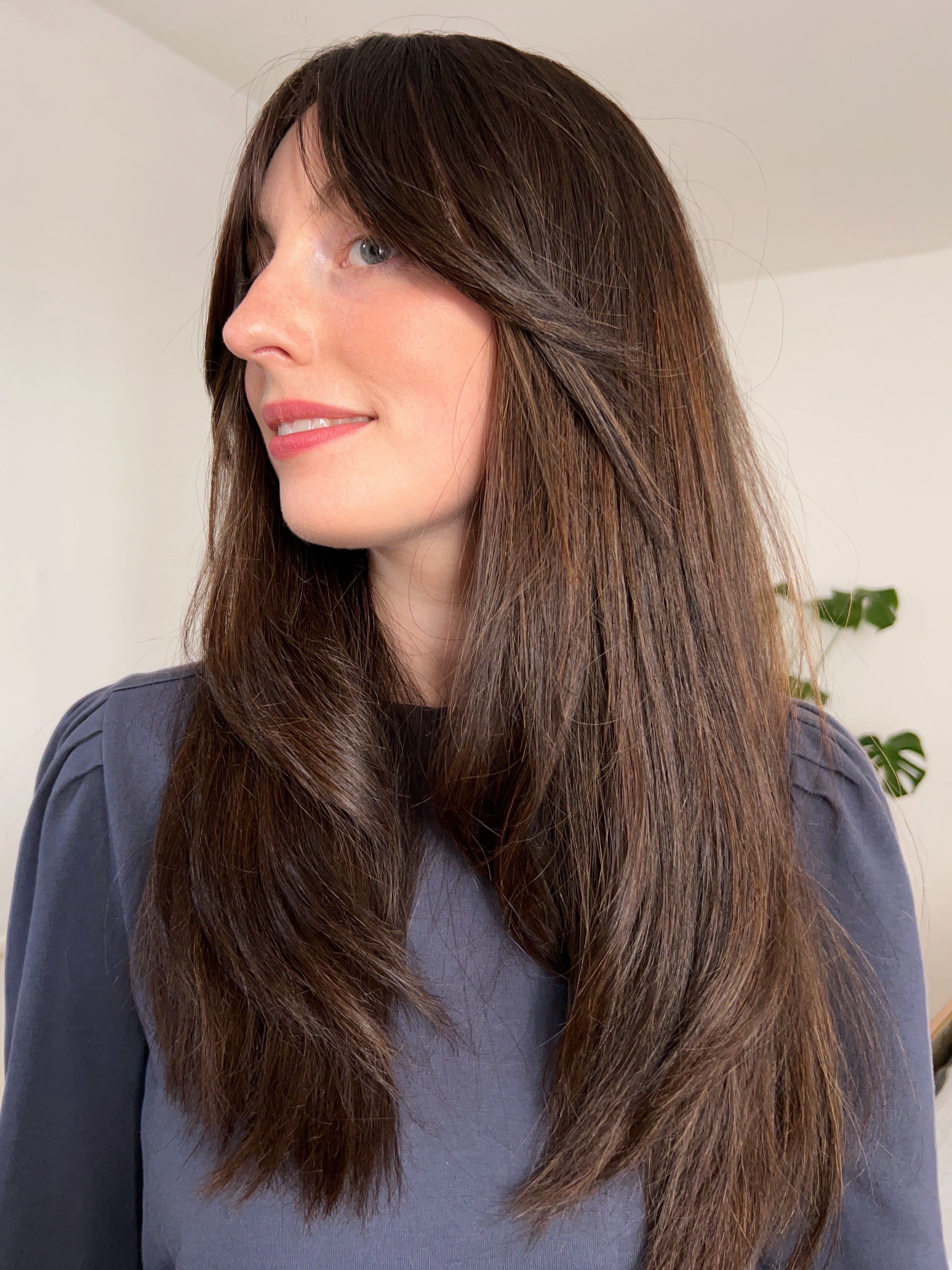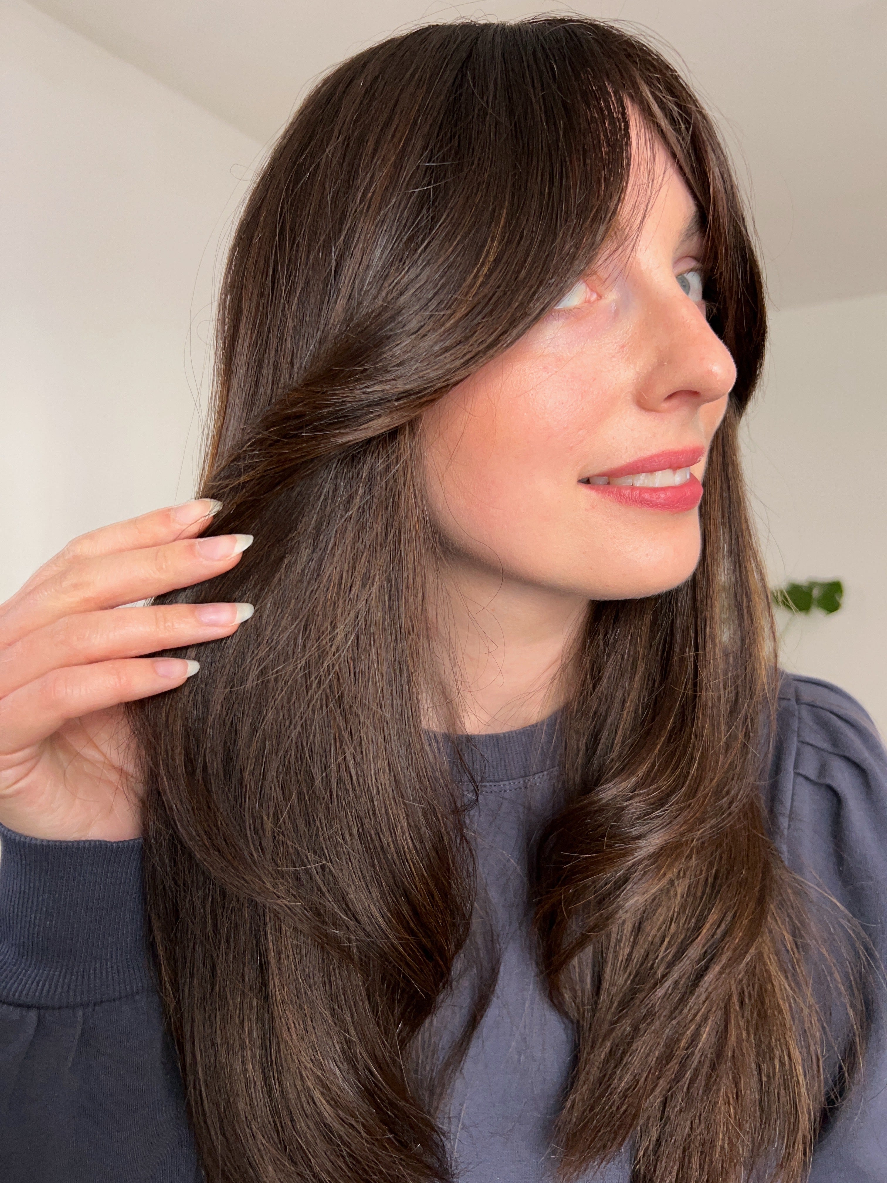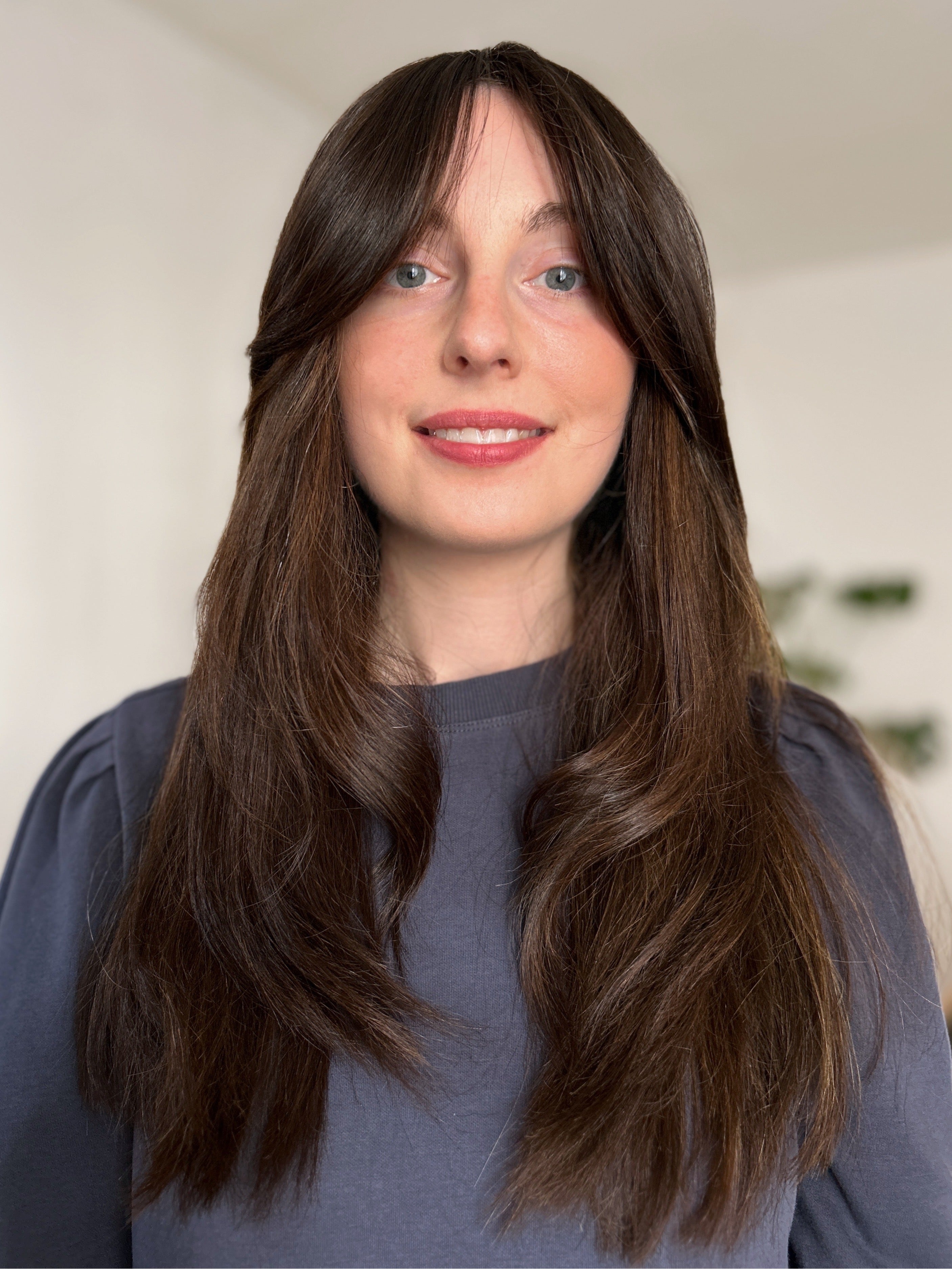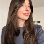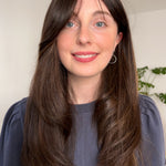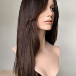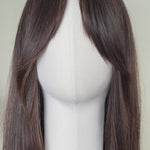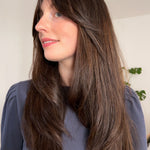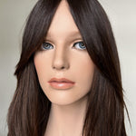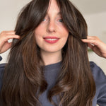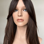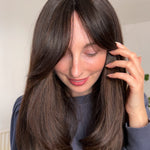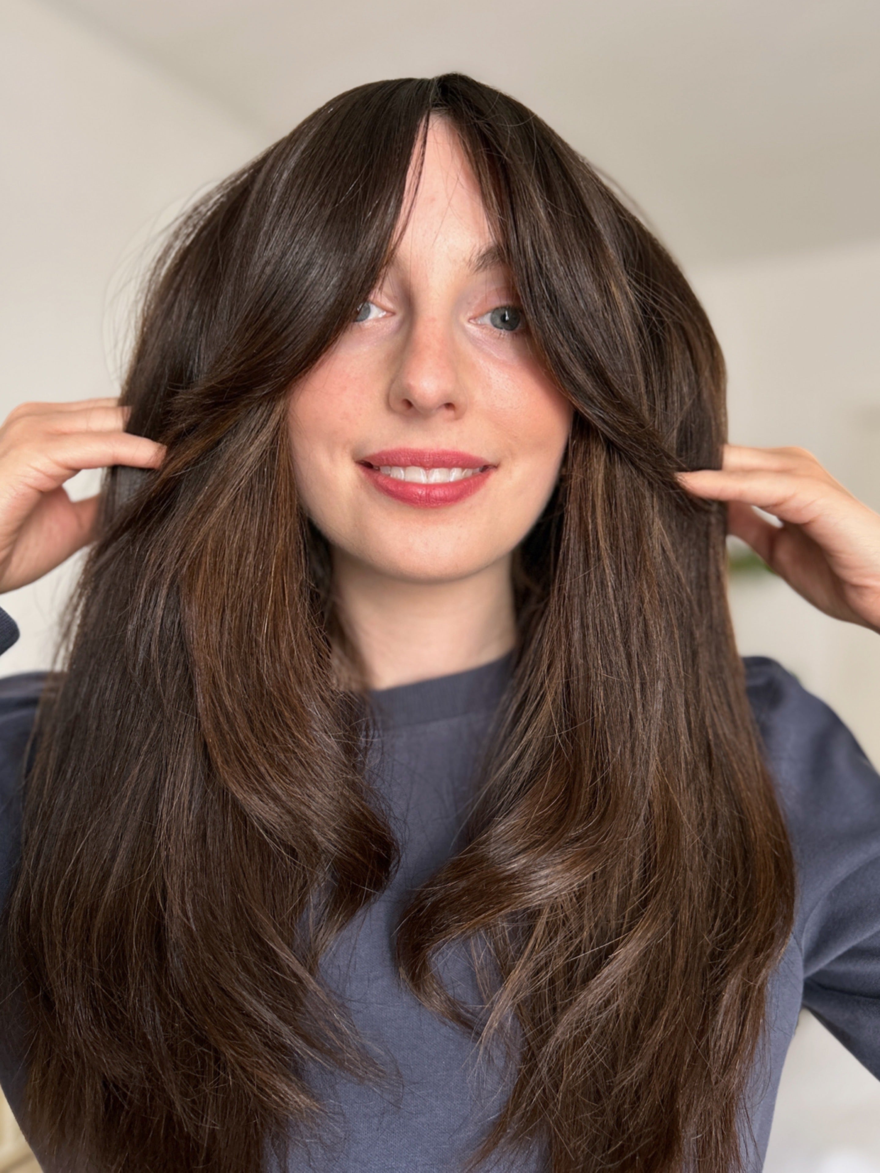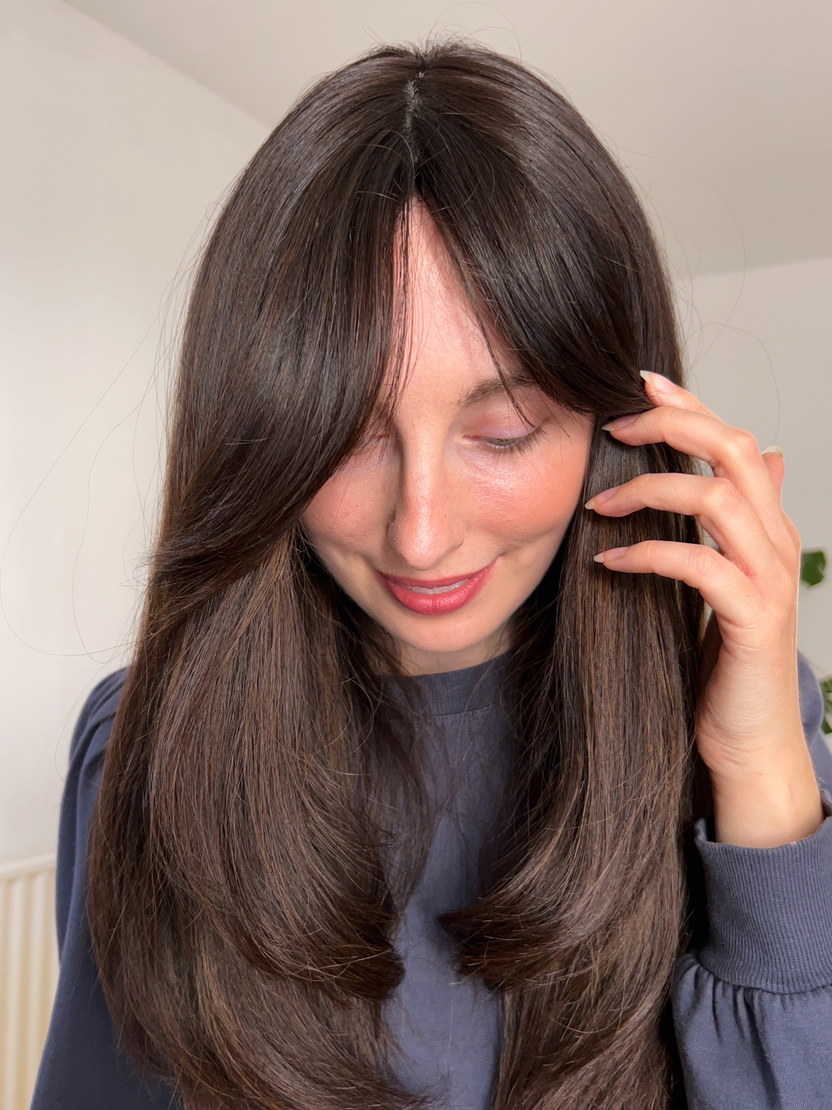 Callaia - a silk top wig in dark virgin brunette, with a subtle warm balayage throughout. This wig has had a full custom cut, with layering and long, sweeping curtain bangs added- graduating down into a feathered face frame.
