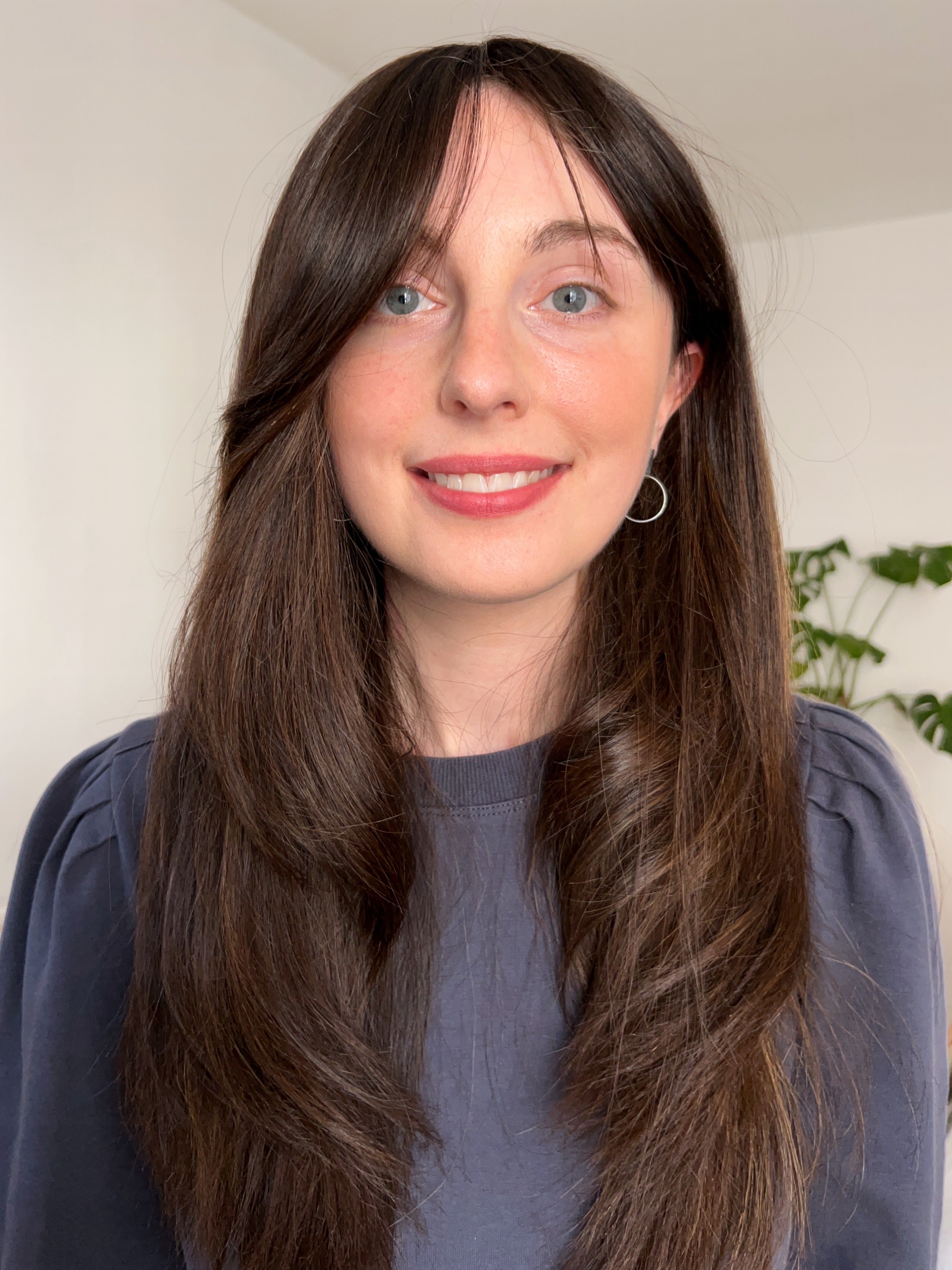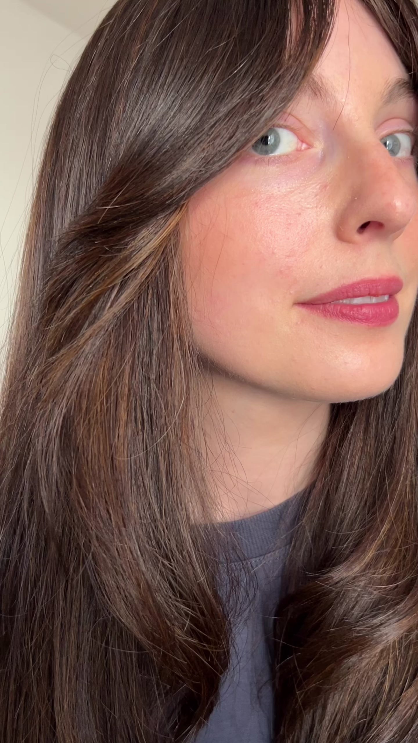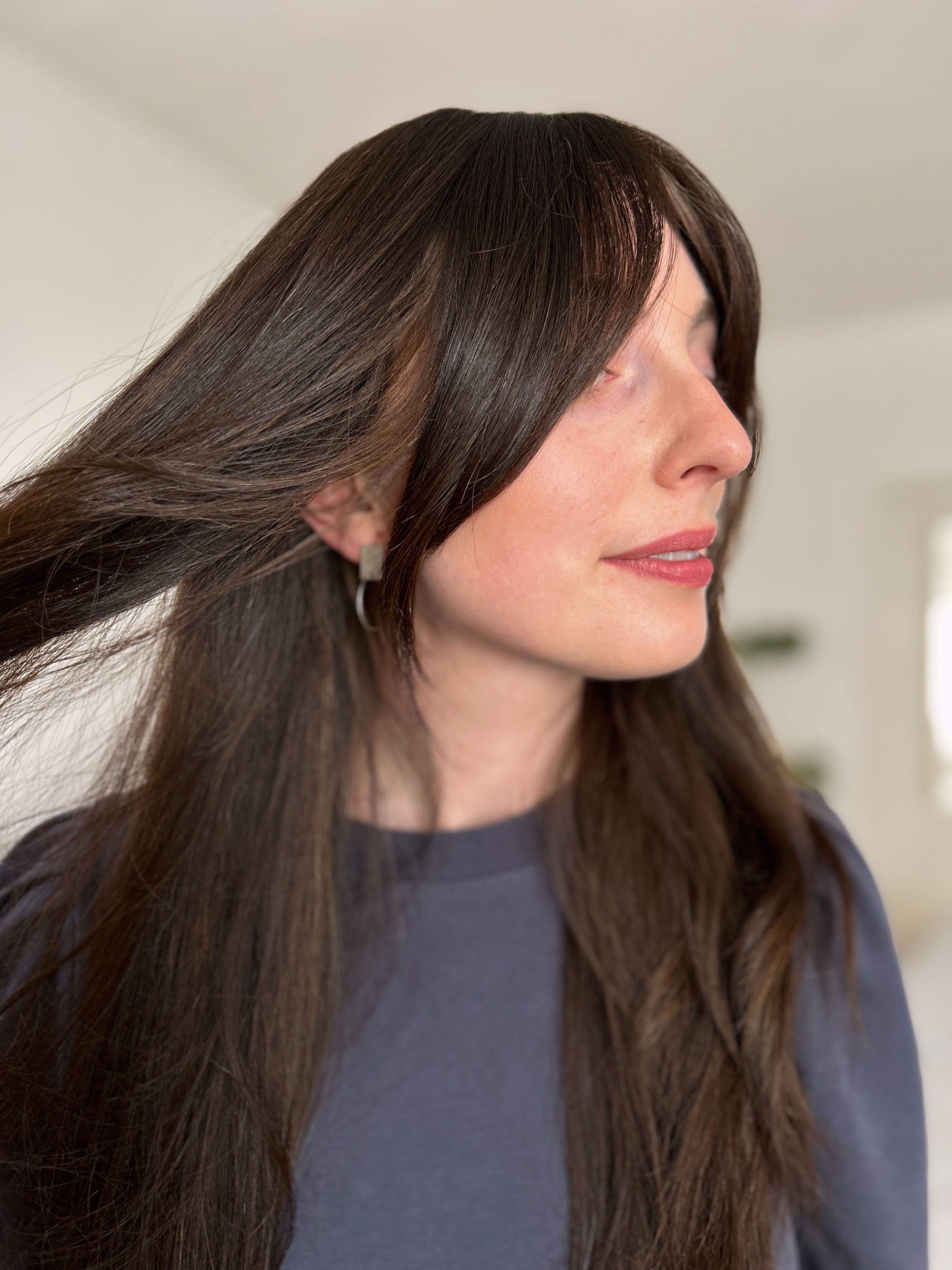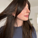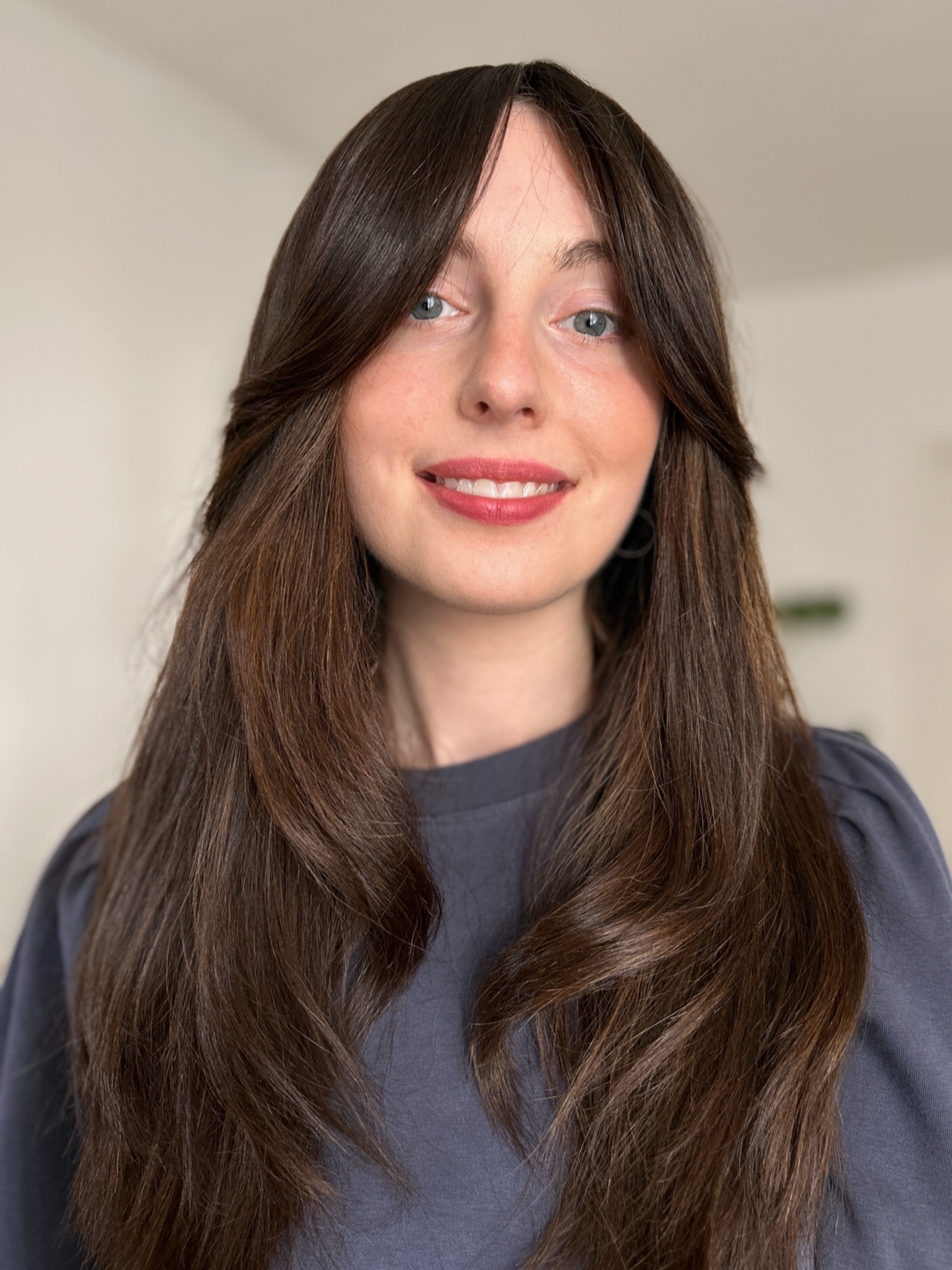 Callaia - a silk top wig in dark virgin brunette, with a subtle warm balayage throughout. This wig has had a full custom cut, with layering and long, sweeping curtain bangs added- graduating down into a feathered face frame.