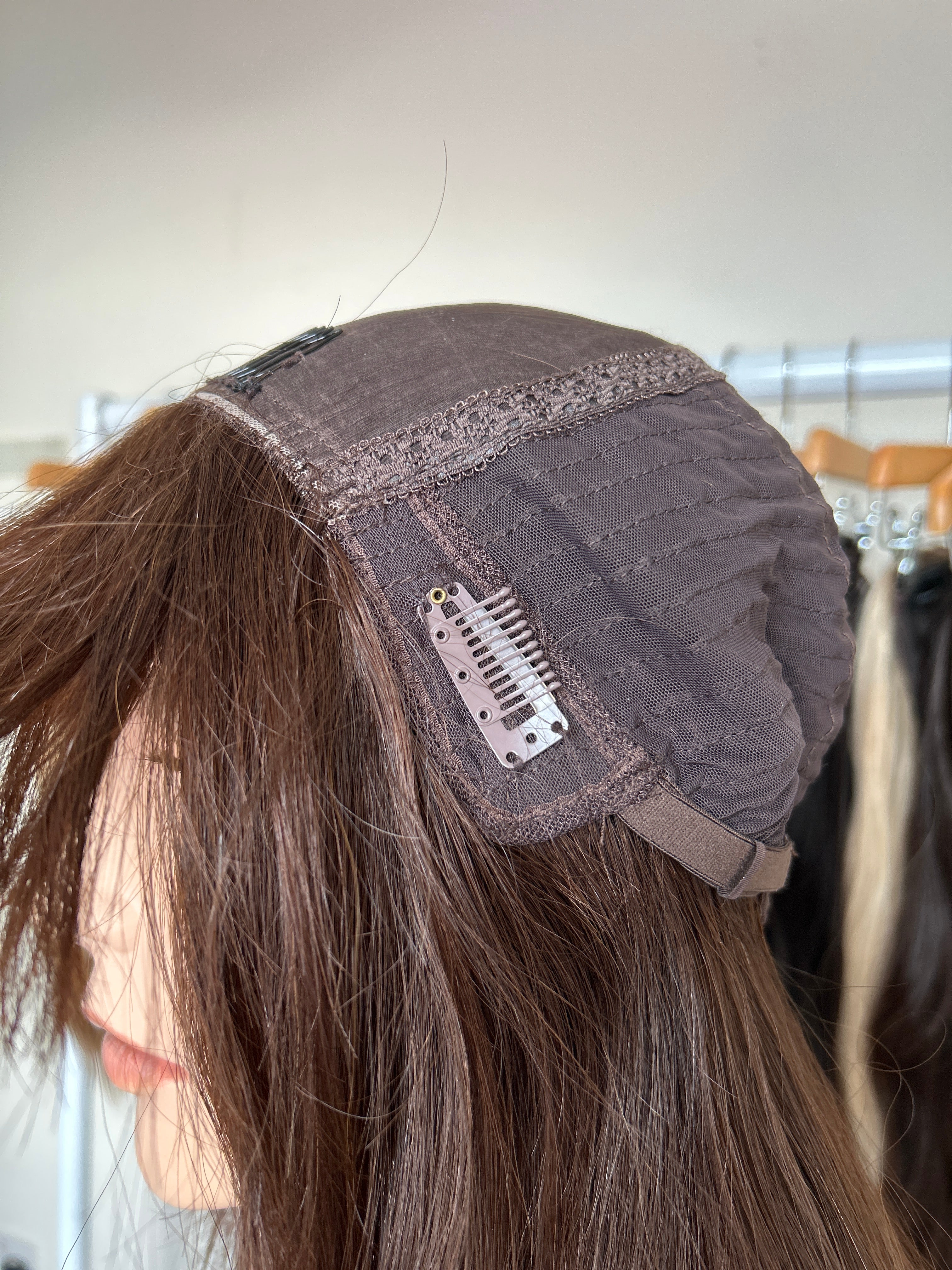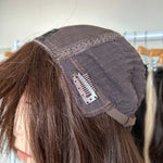 CONSTRUCTION: She has a hand tied silk top realistic parting with light and breathable stretch wefted cap. There is a comb at the front hairline and a clip on each eartab.