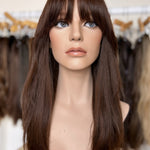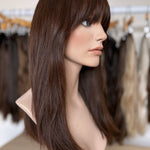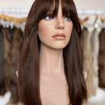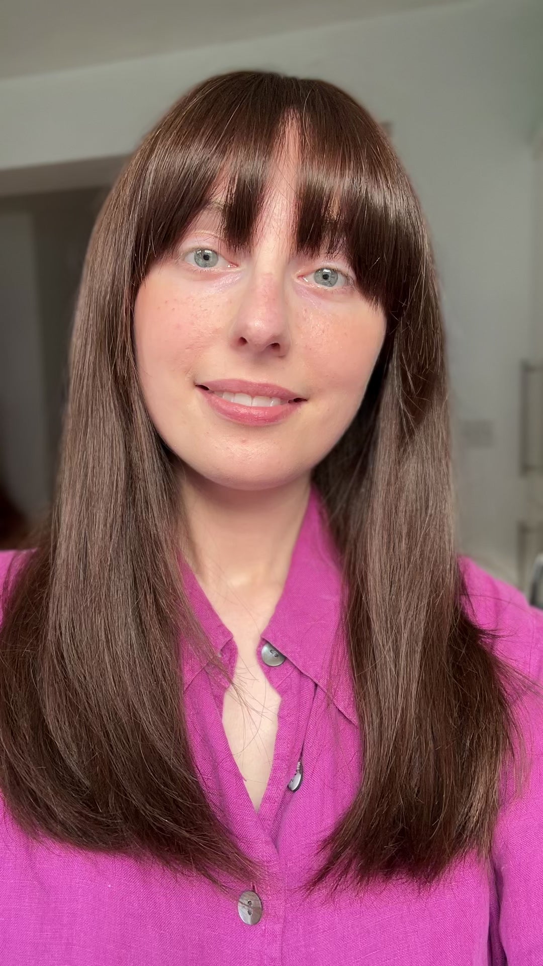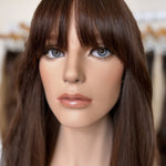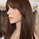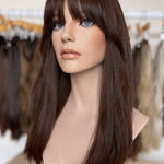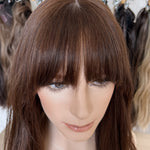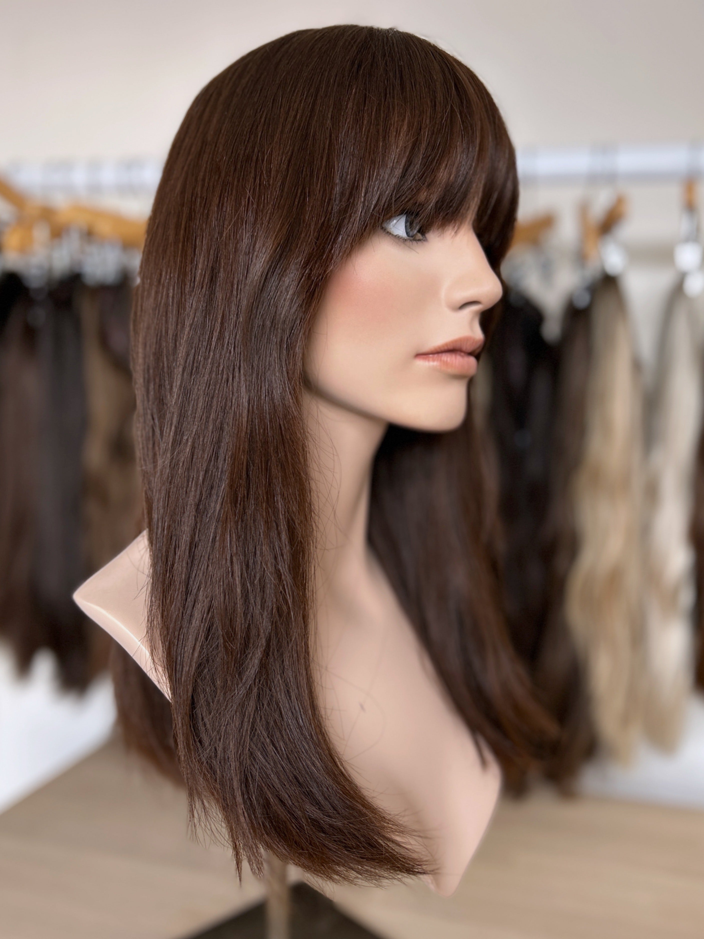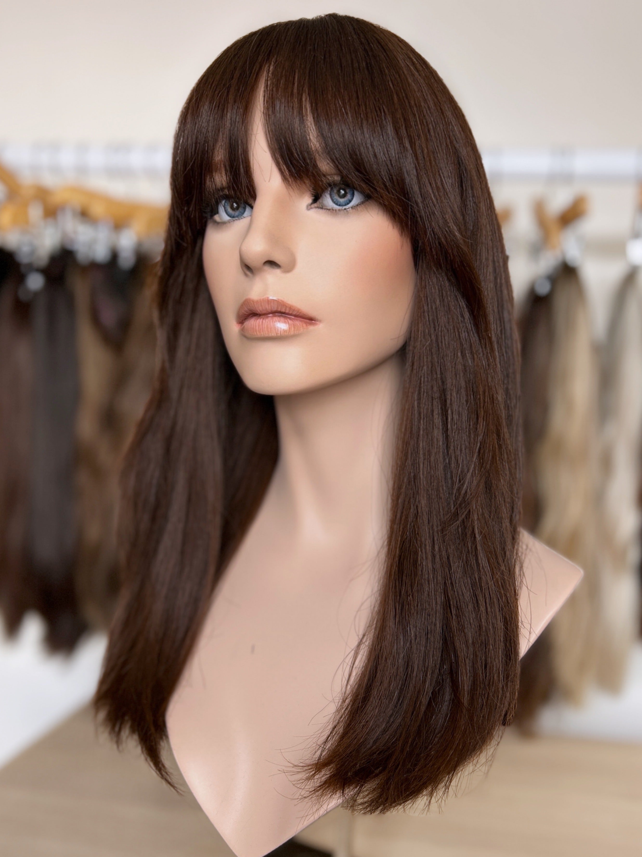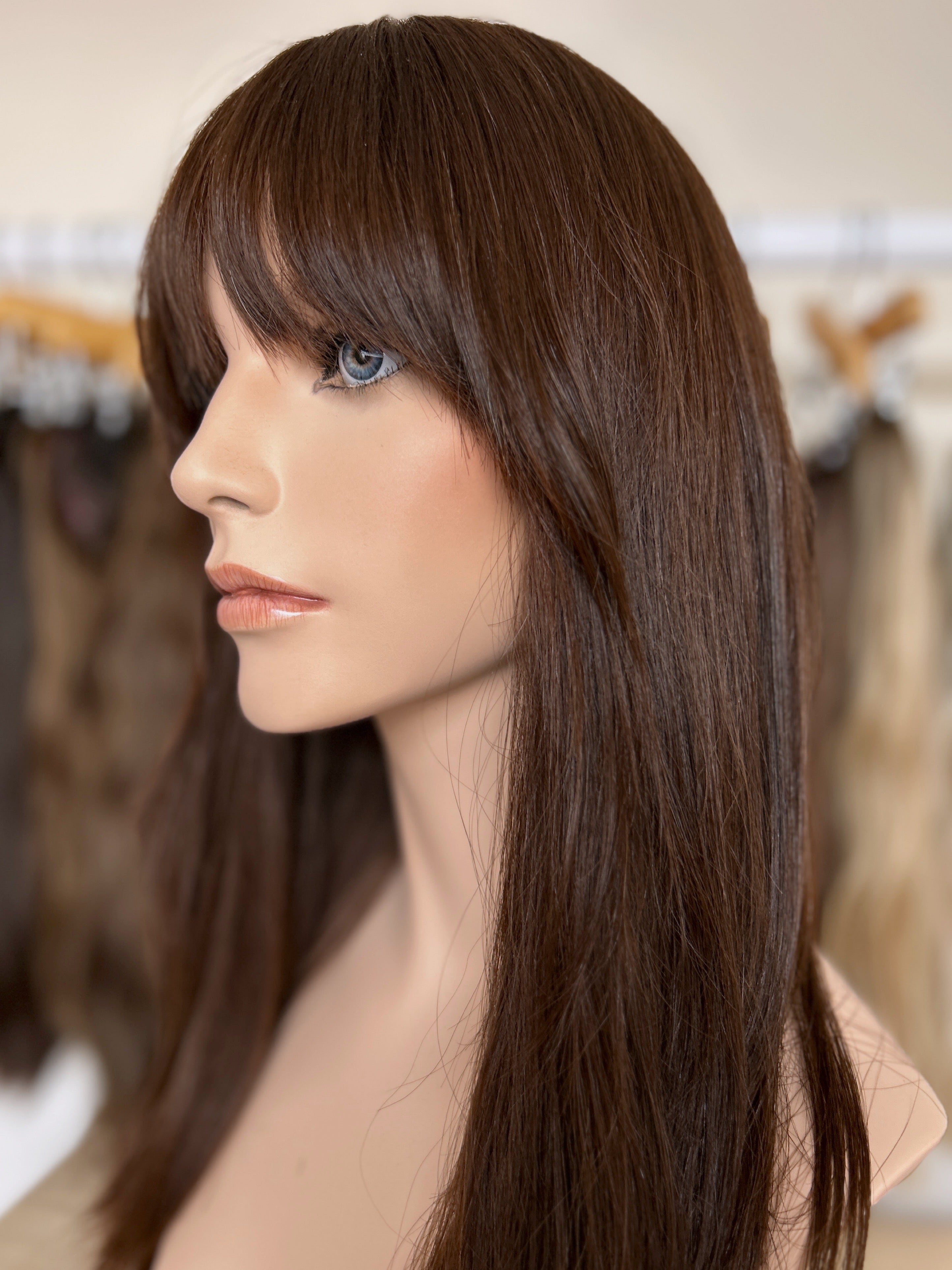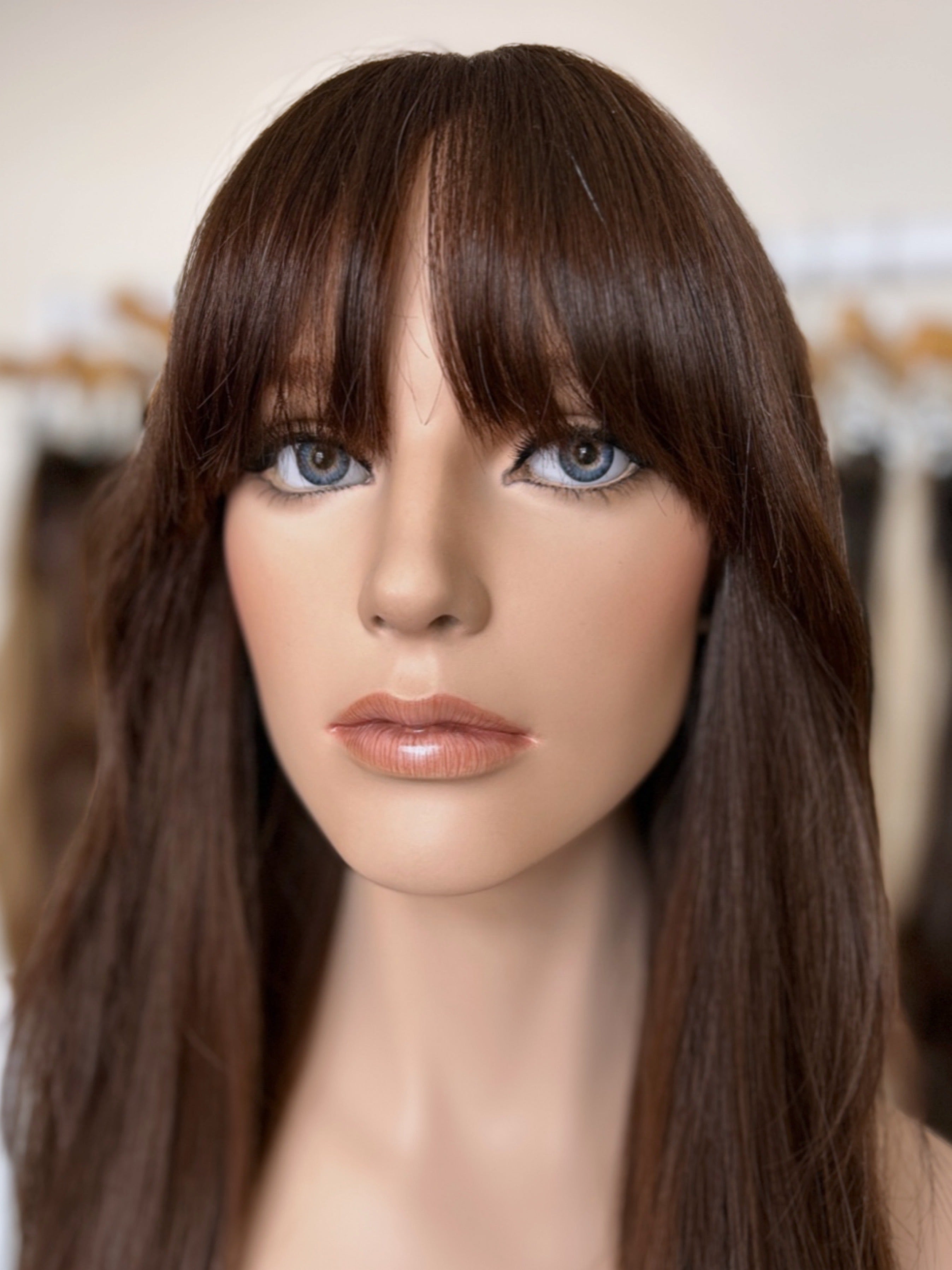 LENGTH: 20” with light layering throughout. Bangs at 4” length from the hairline edge in the centre, graduating down to a face frame.