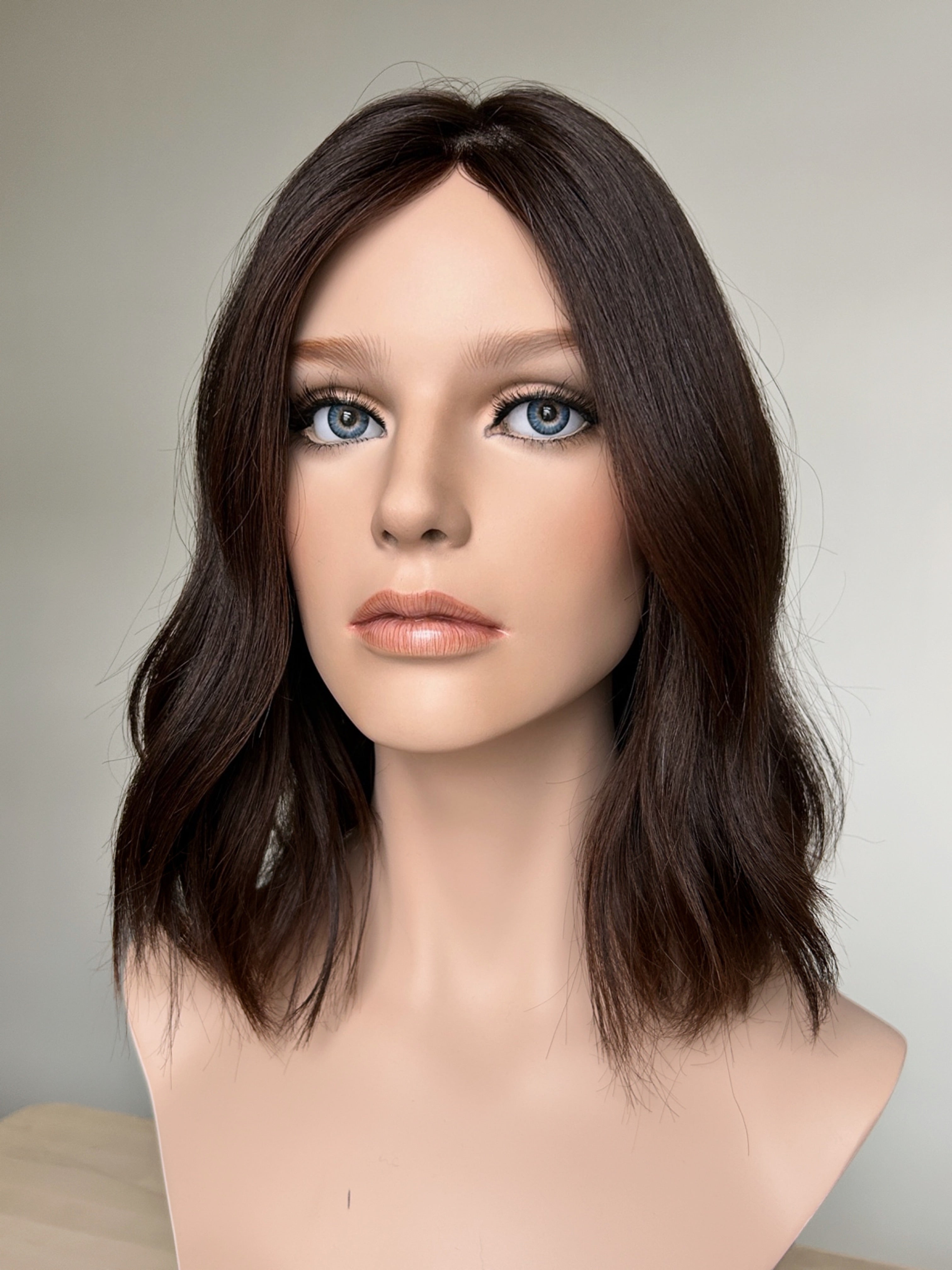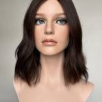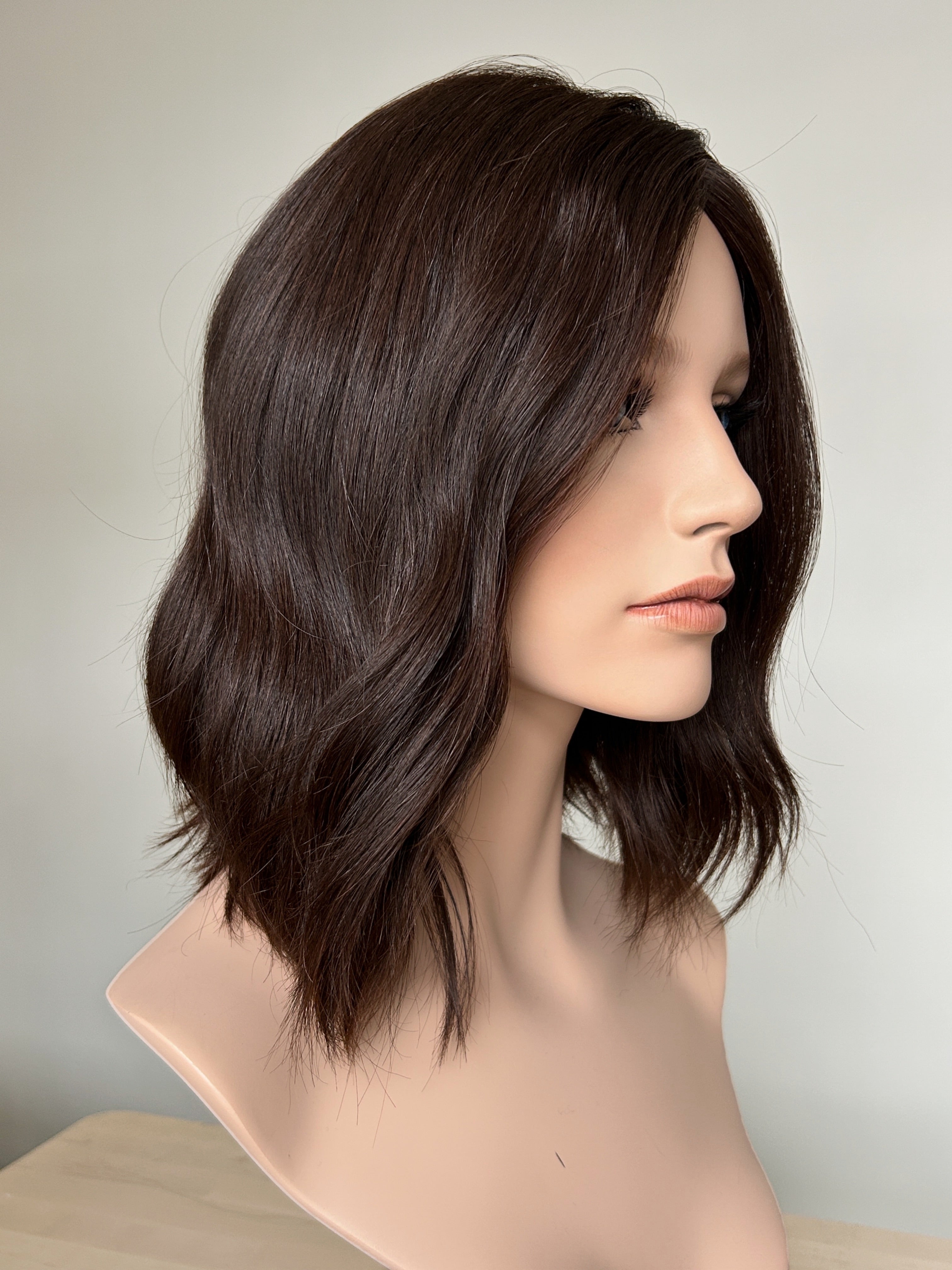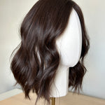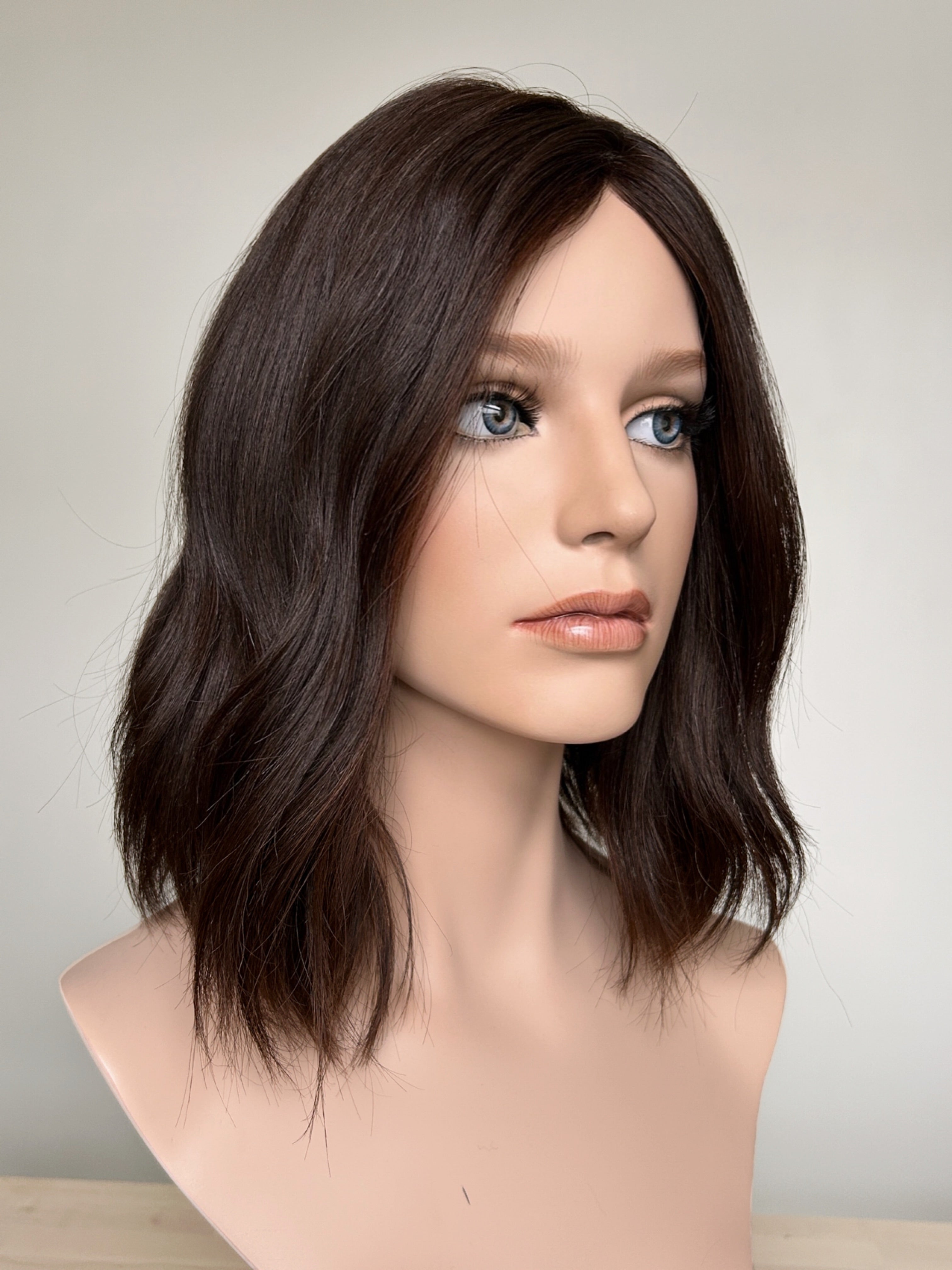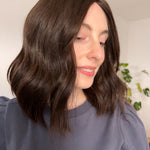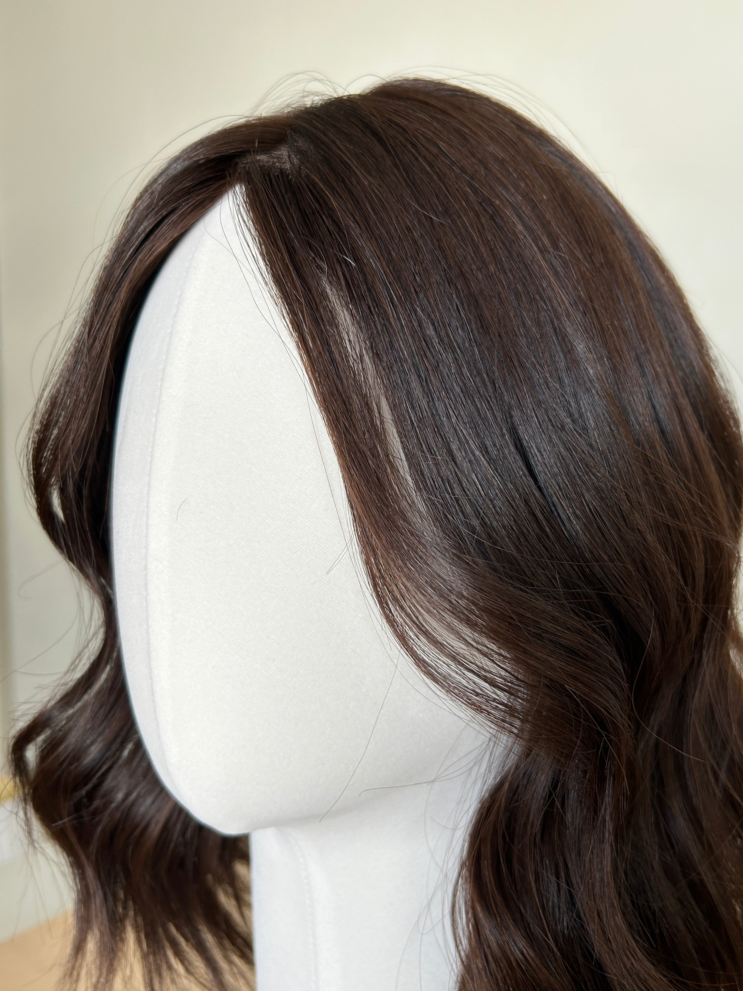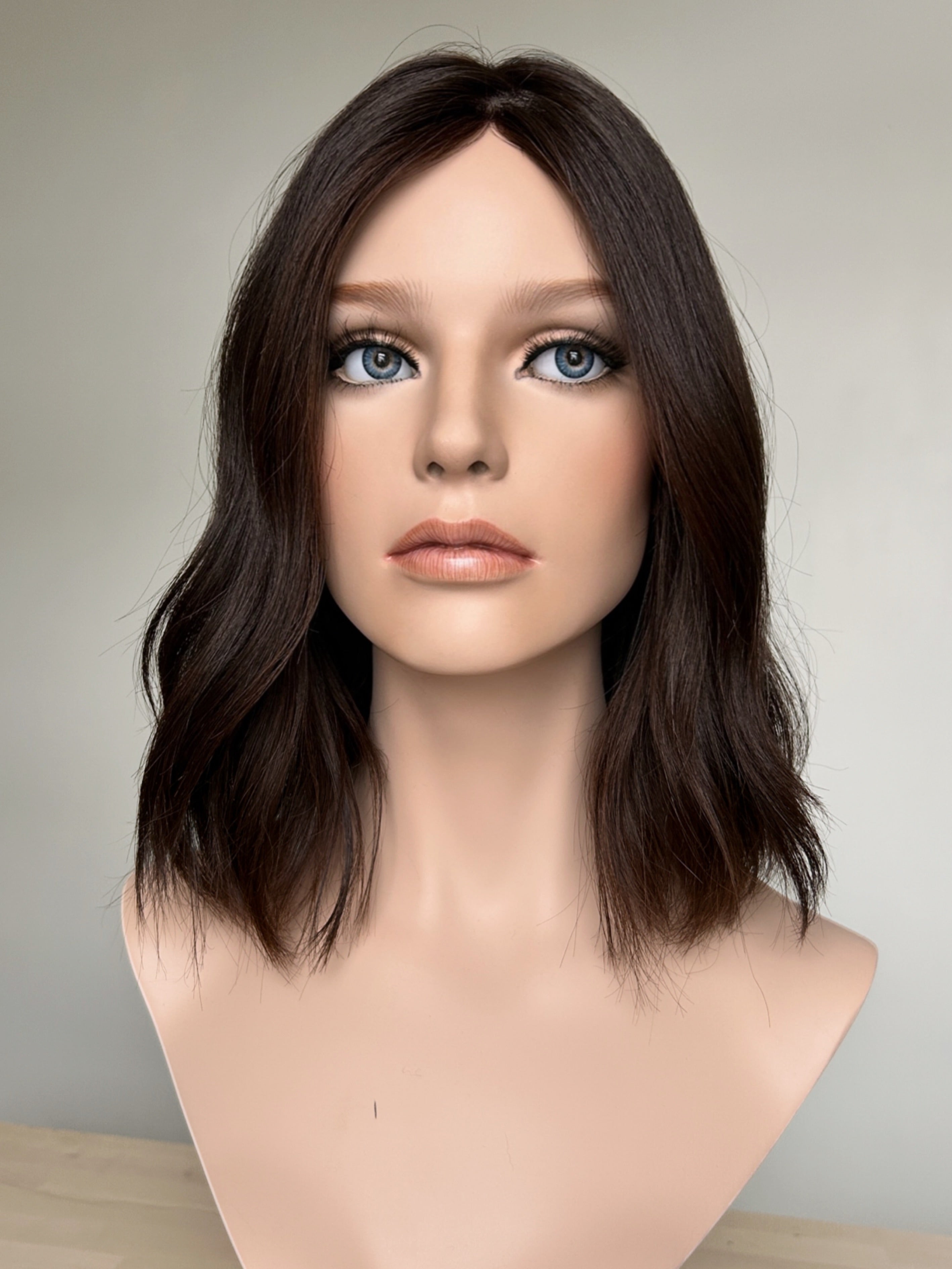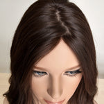 BLUEBELL - a silk top wig in dark virgin neutral brunette. She has a smooth, fine texture with natural movement and soft light layering throughout for a polished, wearable look.