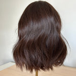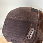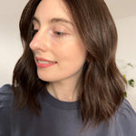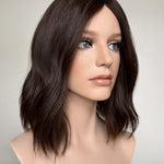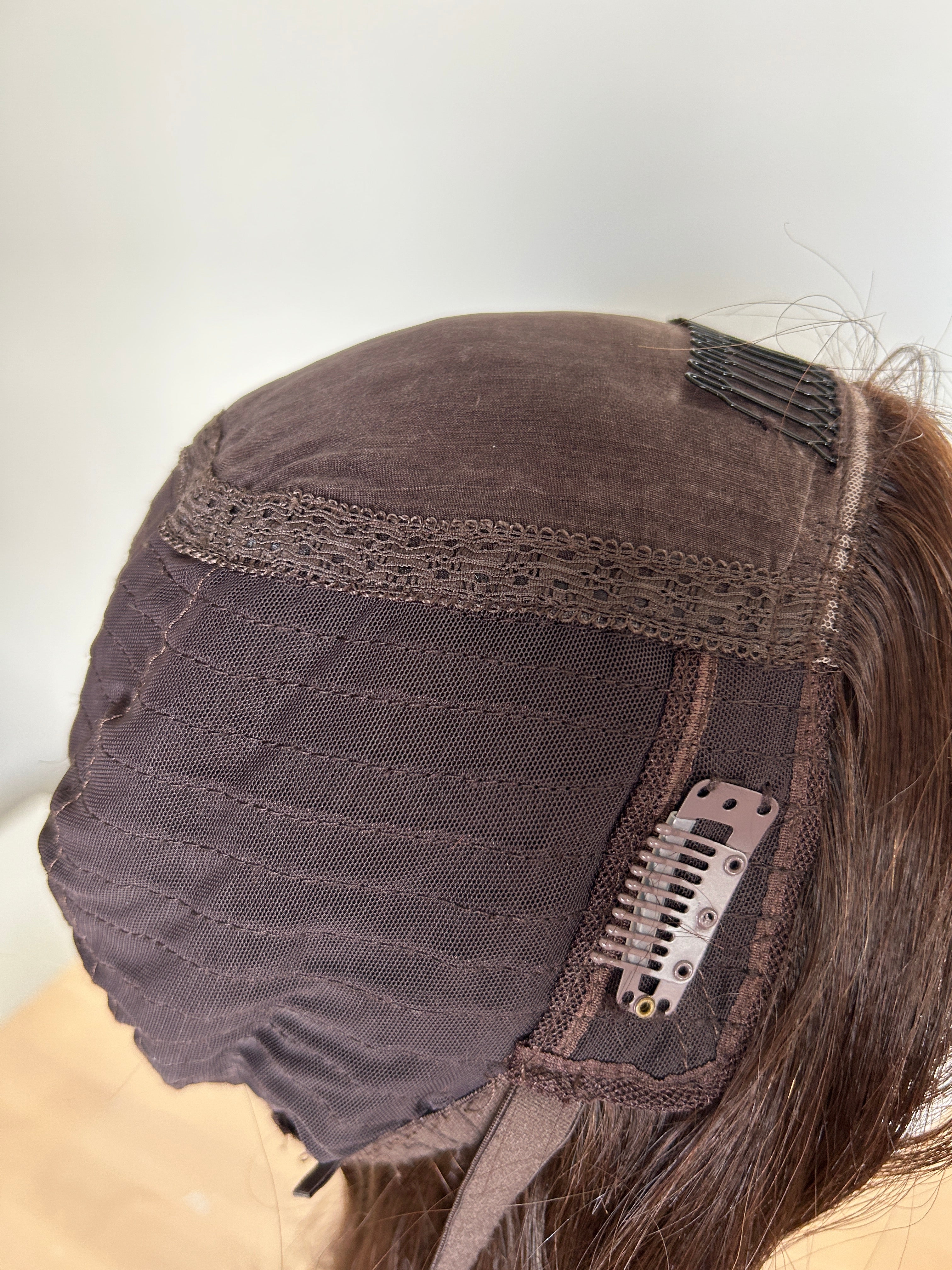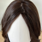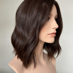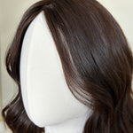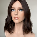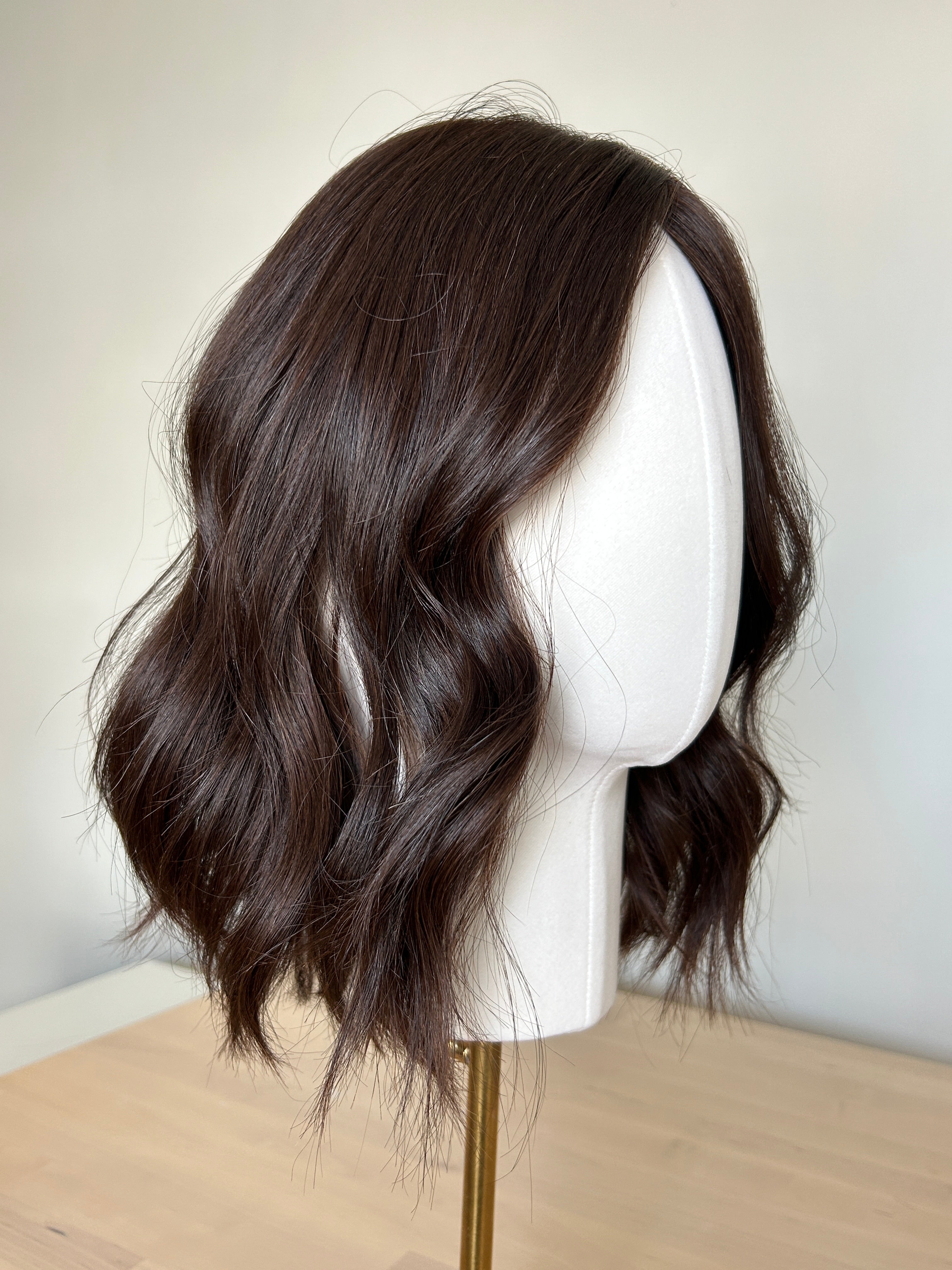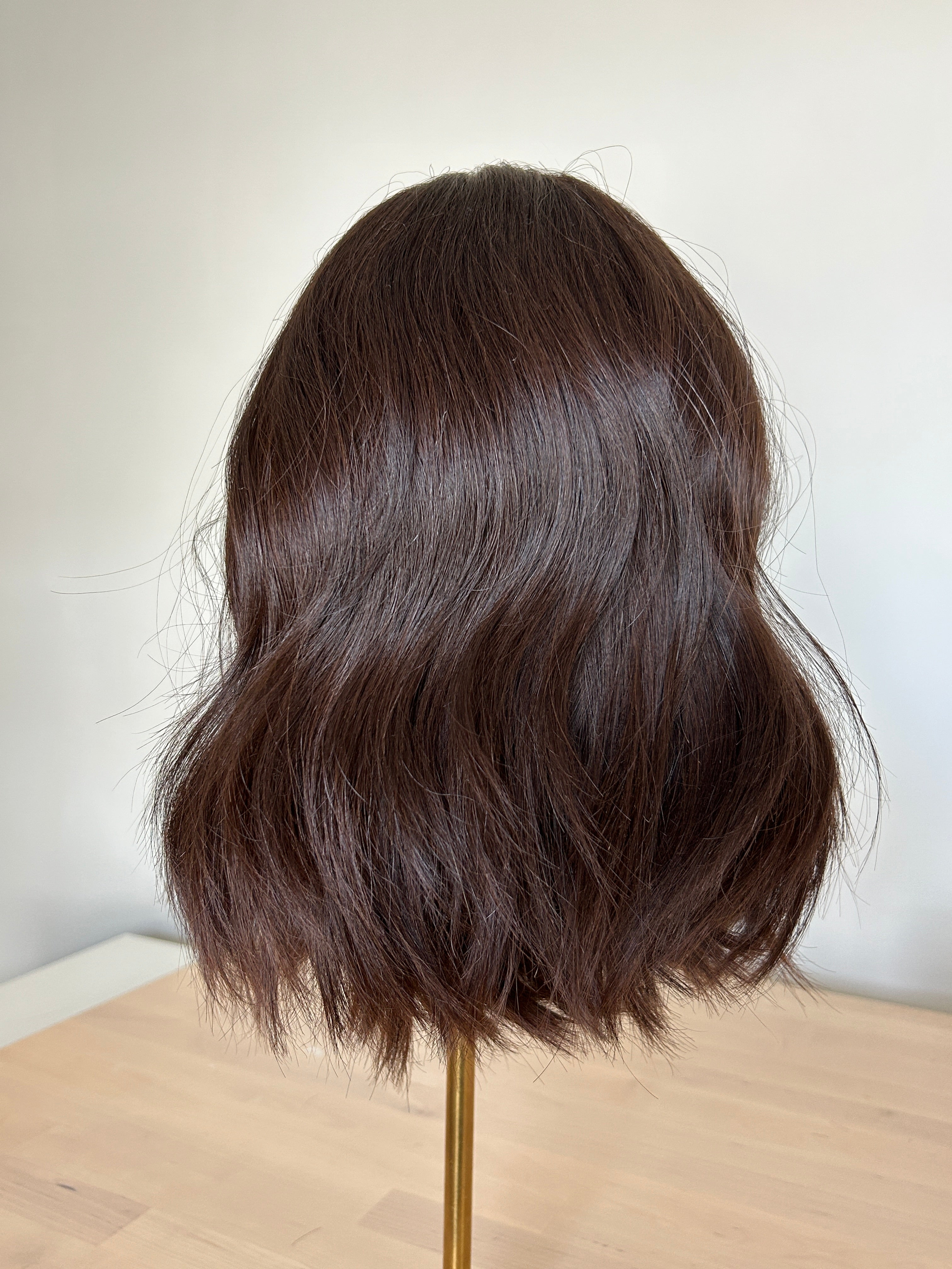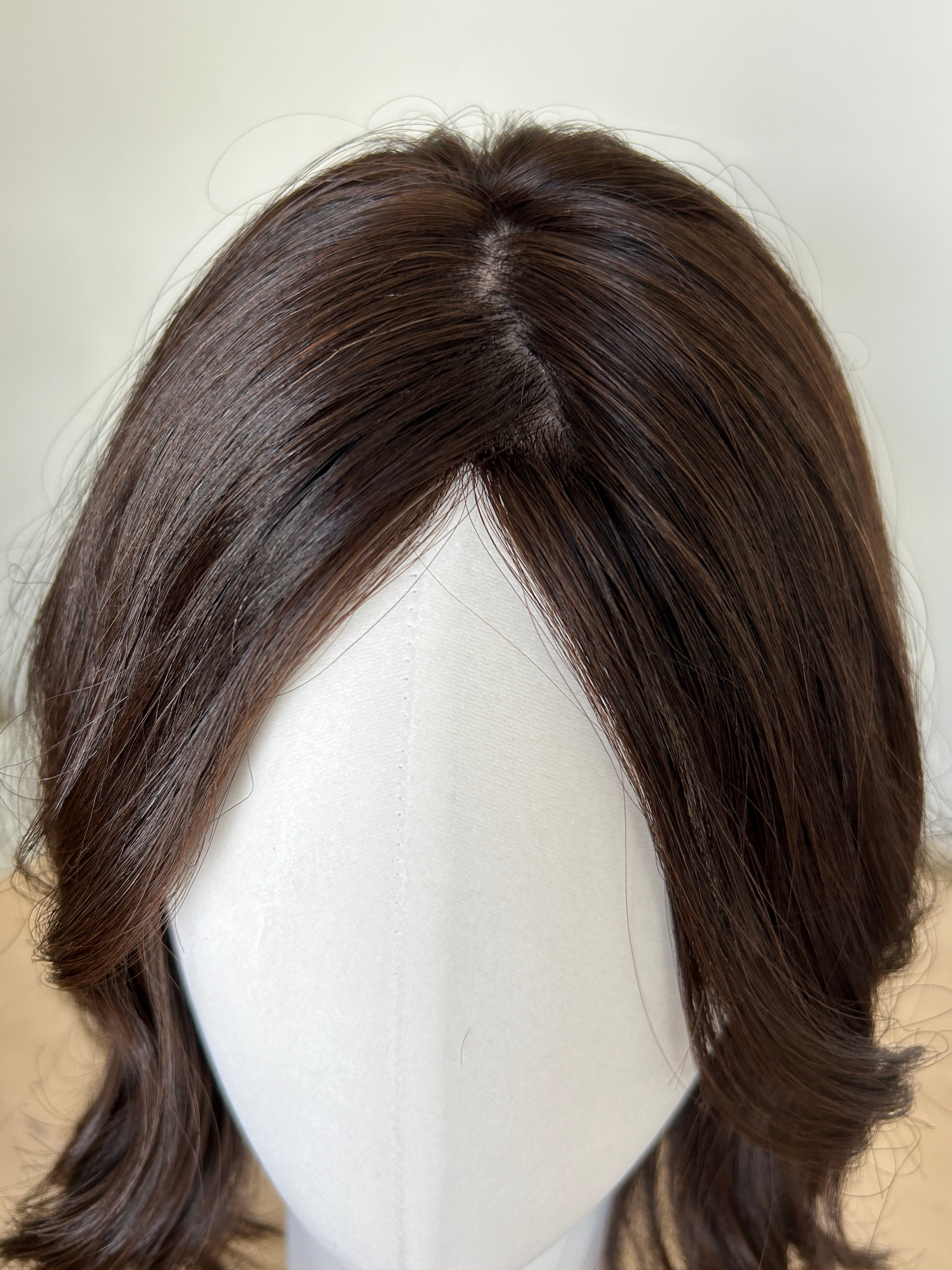 BLUEBELL - a silk top wig in dark virgin neutral brunette. She has a smooth, fine texture with natural movement and soft light layering throughout for a polished, wearable look.