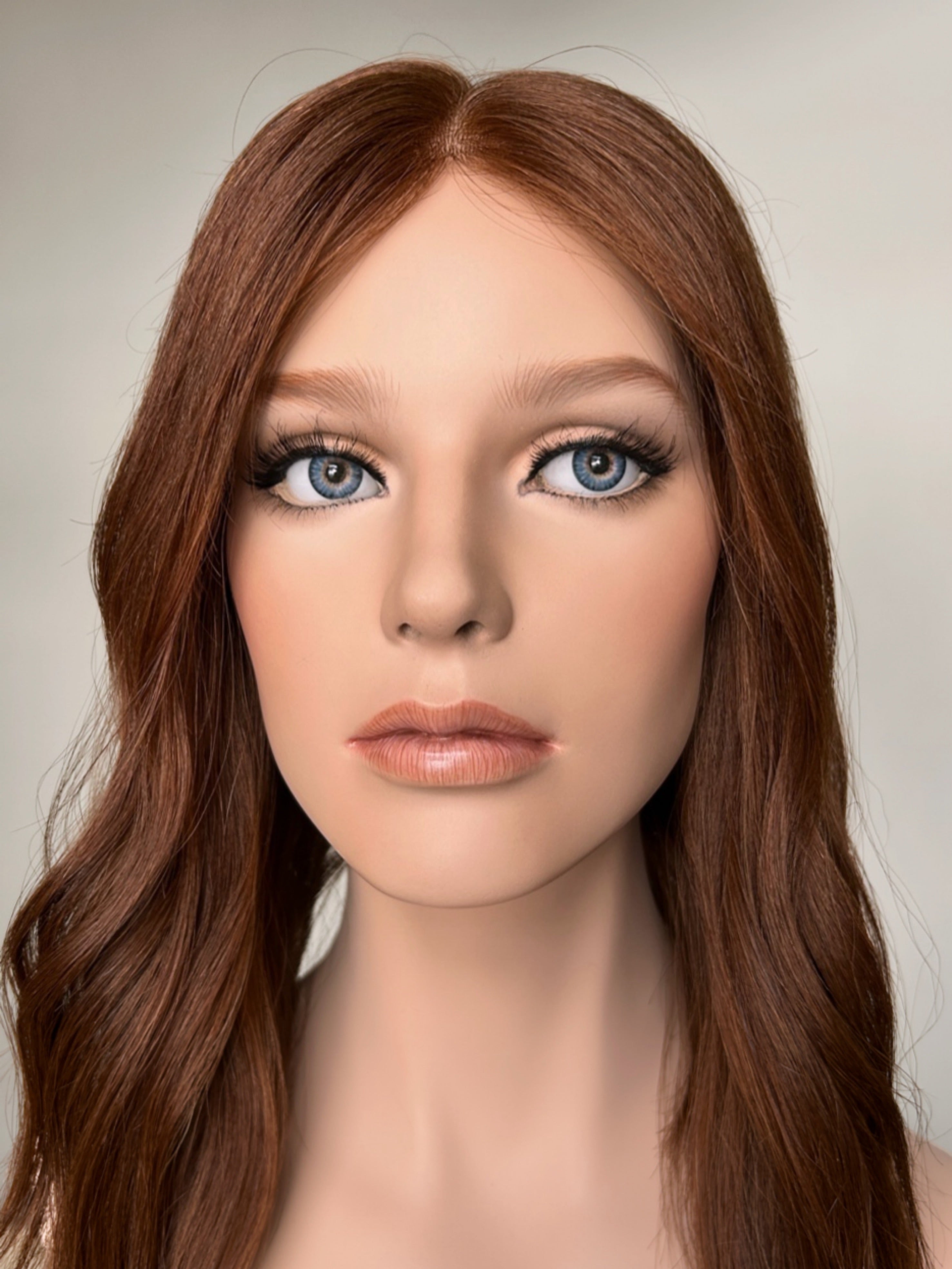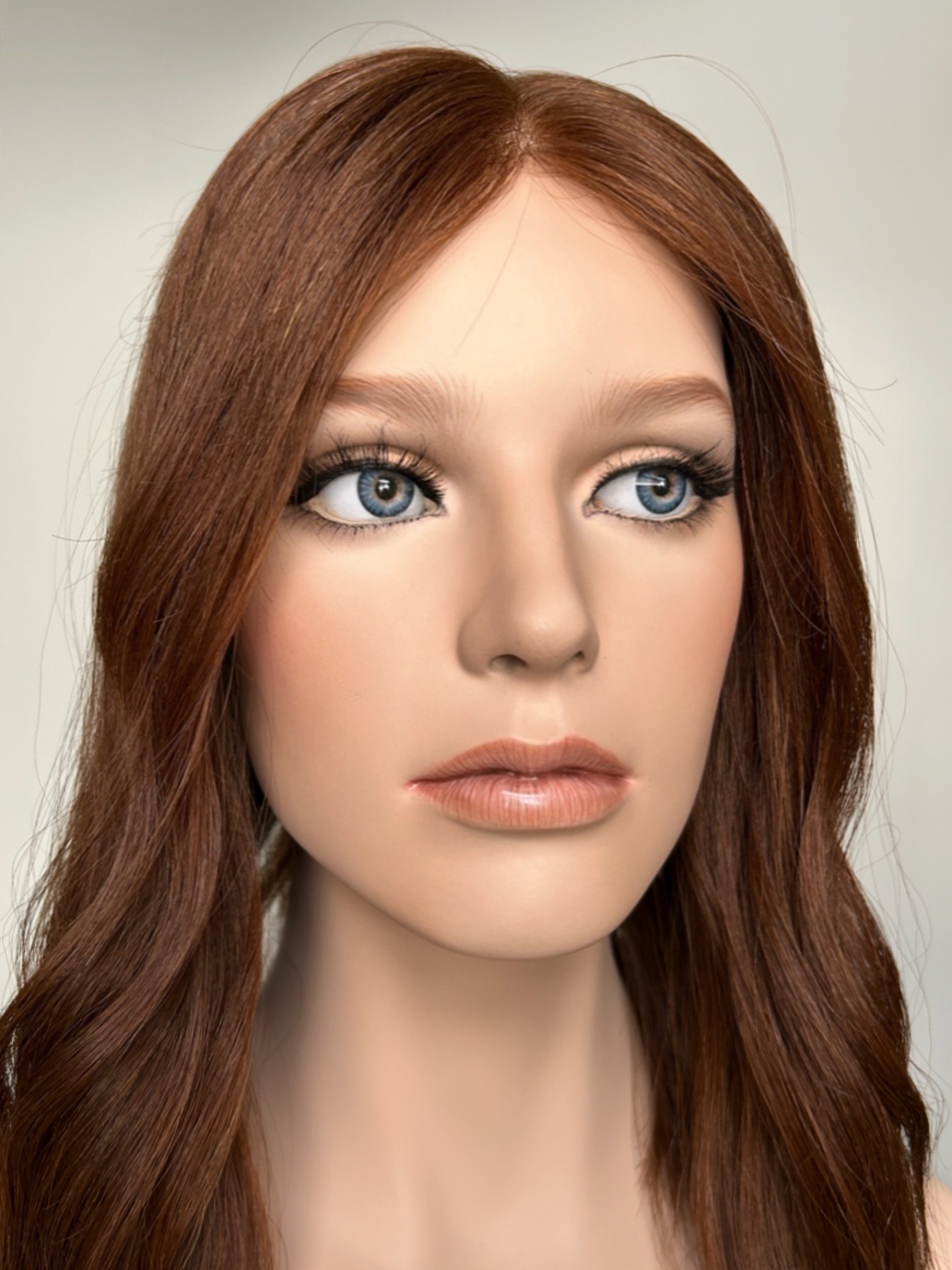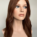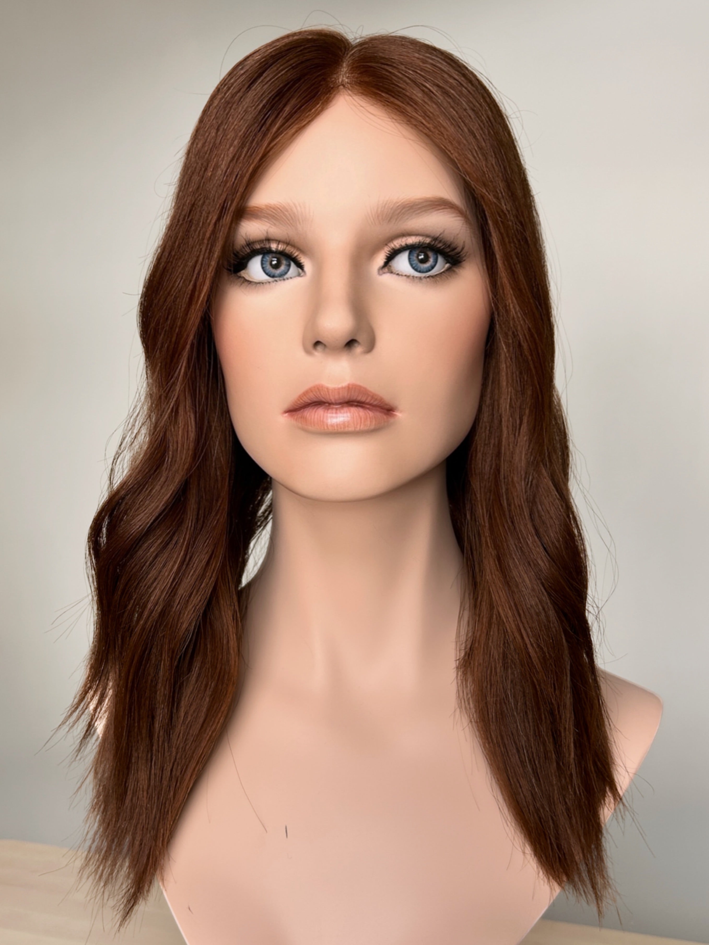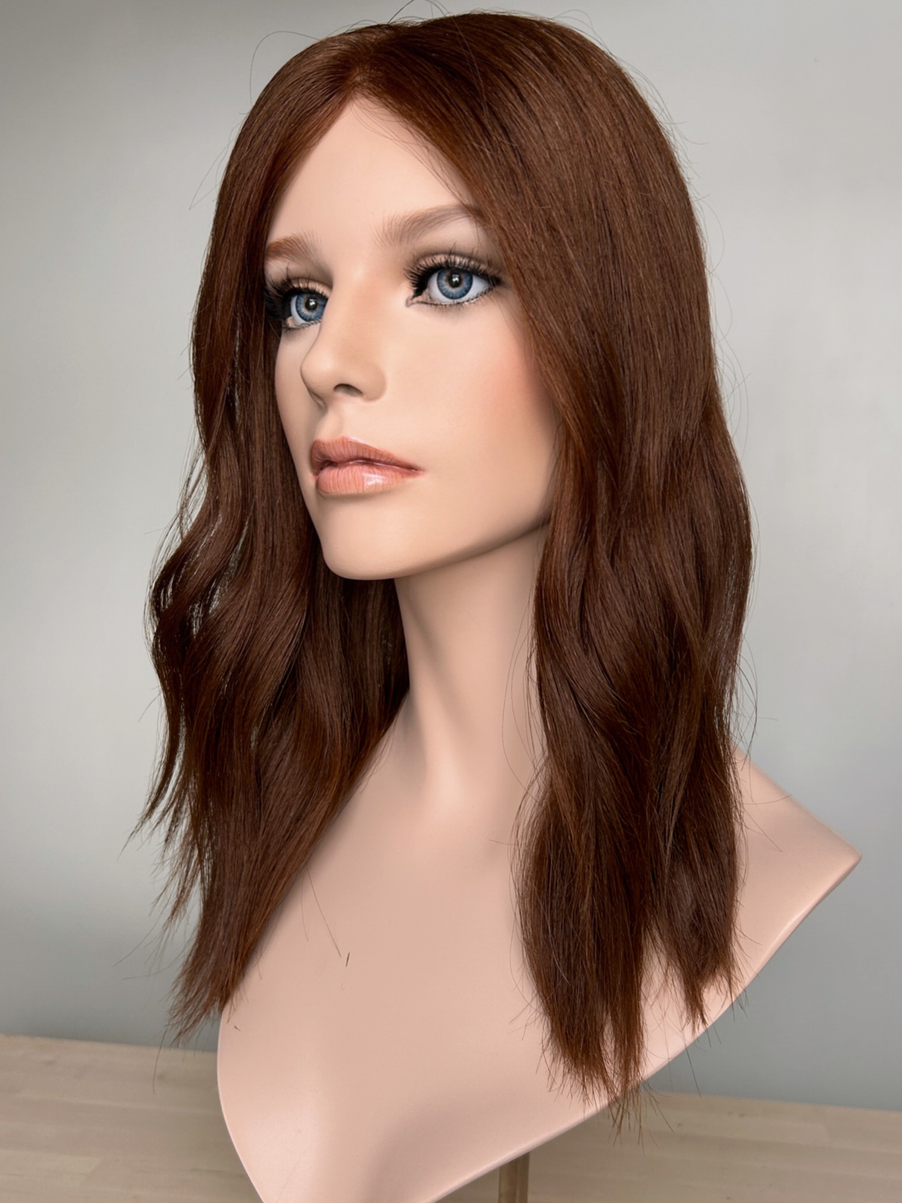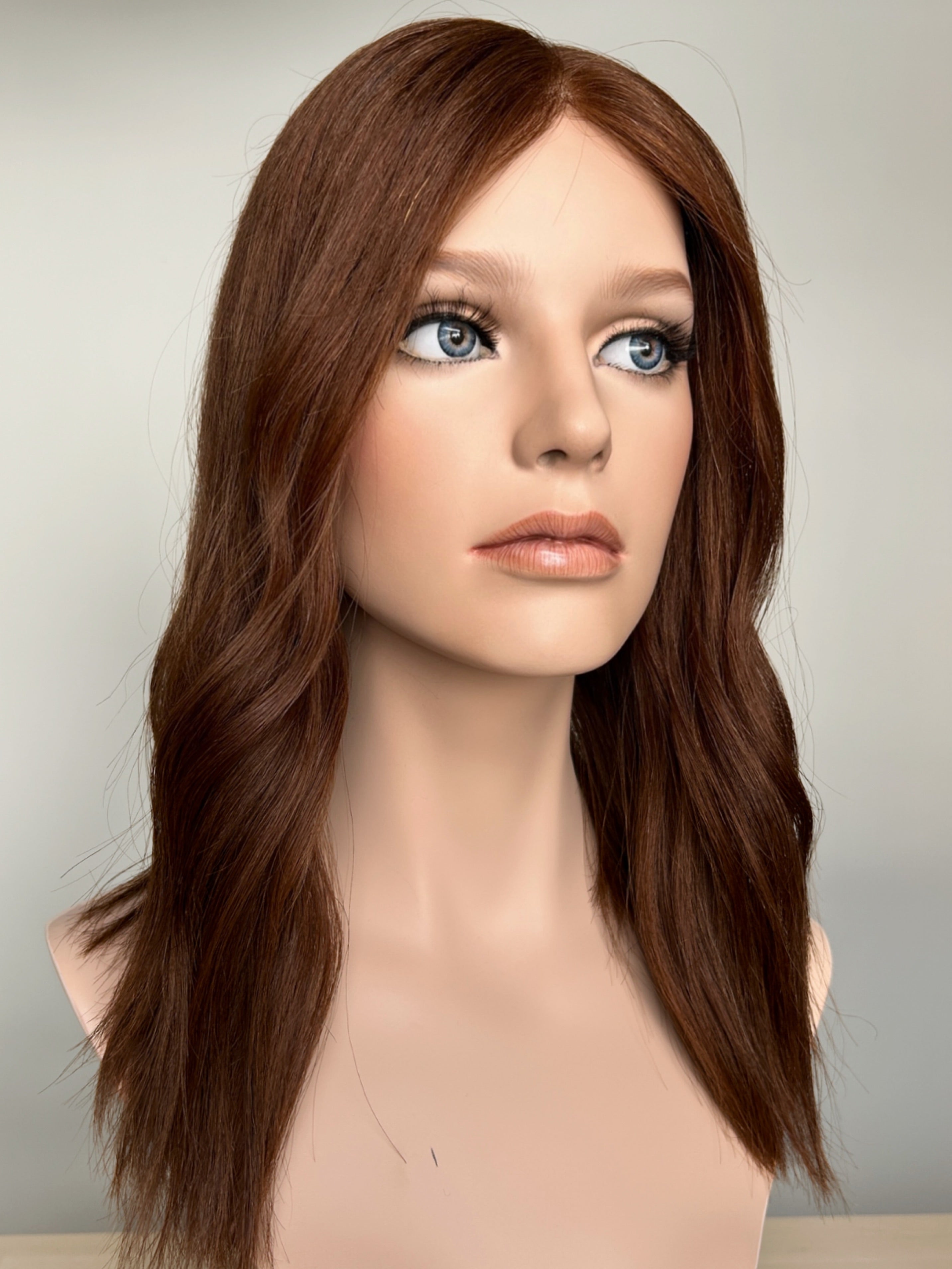 Violet - a lace top topper in beautiful medium copper auburn, it has a super lightweight lace top, with a closed lace front. Perfect if you're looking for a flat construction, and natural light volume. This construction is perfect for every day and is really lightweight and breathable to wear.