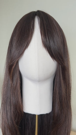 Callaia - a silk top wig in dark virgin brunette, with a subtle warm balayage throughout. This wig has had a full custom cut, with layering and long, sweeping curtain bangs added- graduating down into a feathered face frame.