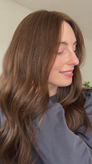 Carnation - a lace top clip-in topper in medium warm brunette with subtle golden dimension. Cut with soft layers and a gentle face frame for easy styling and blending.